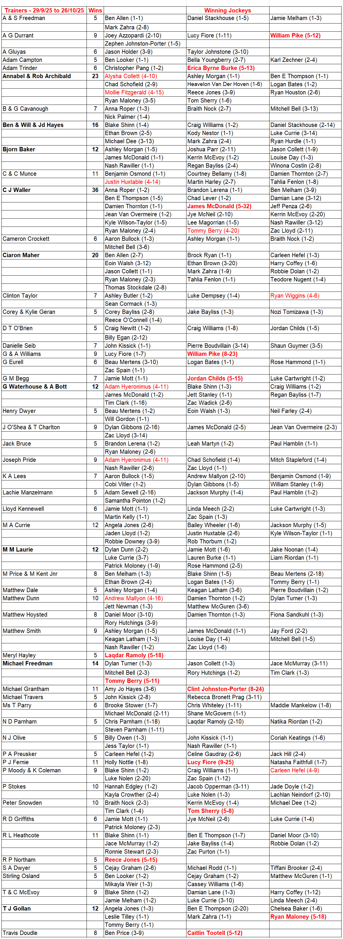 Each Monday I post a table showing the stables that have won at least 5 races over the previous 4 weeks and list the jockeys who rode at least one of those winners, as well as their total rides for the stable, during that period.