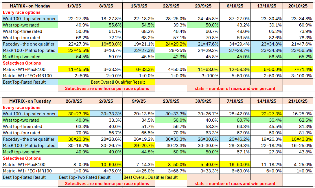 • Matrix - day by day analysis for Monday and Tuesday racing