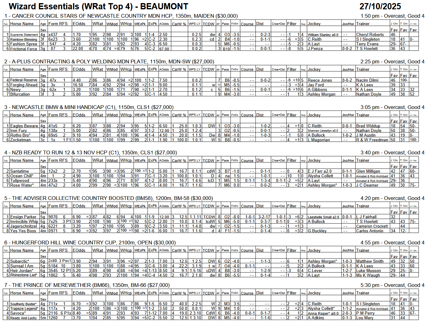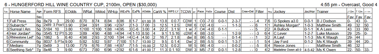 In addition to this Essentials WRat4 report there is also an Essentials Full-Field version available. Here is one race from that report for this meeting: