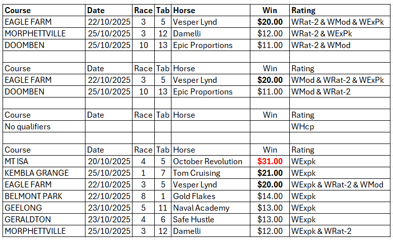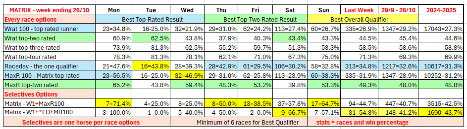 The full day-by-day results for Wizard (Wrat) top 4 rated runners, the Raceday Qualifier, and the Matrix (MaxR) 100 pointer, the MaxR top-two, the Matrix W1+MaxR100 qualifier, and the Matrix W1+*EO+MaxR100 qualifier. Also included are the overall results for last week and the last four weeks. The 2023-2024 column shows the WRat results for the full 2023-2024 racing season. This results summary is colour coded so that it is easier for readers to track the relative performance of the Top Rated (blue) and Top-Two Rated (green) ratings options on a daily, and longer term, basis. The best overall qualifier (yellow) is also highlighted. (The Matrix report is posted to this website between 10:30am and 10:45am, and updated around 12 noon, each day.)