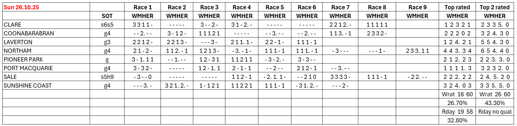 Header: WMHER = WRat (W), WMod (M), WHcp (H), WExpk (E), Raceday (R).