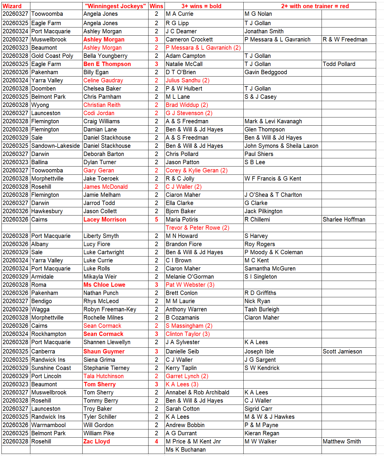 Here is the list of jockeys who rode at least a double at any of the Tab meetings last week, along with the trainers for whom they rode the winners. This table is colour coded to highlight the outperformers and it is definitely worth noting these riders and combinations.