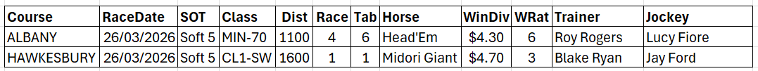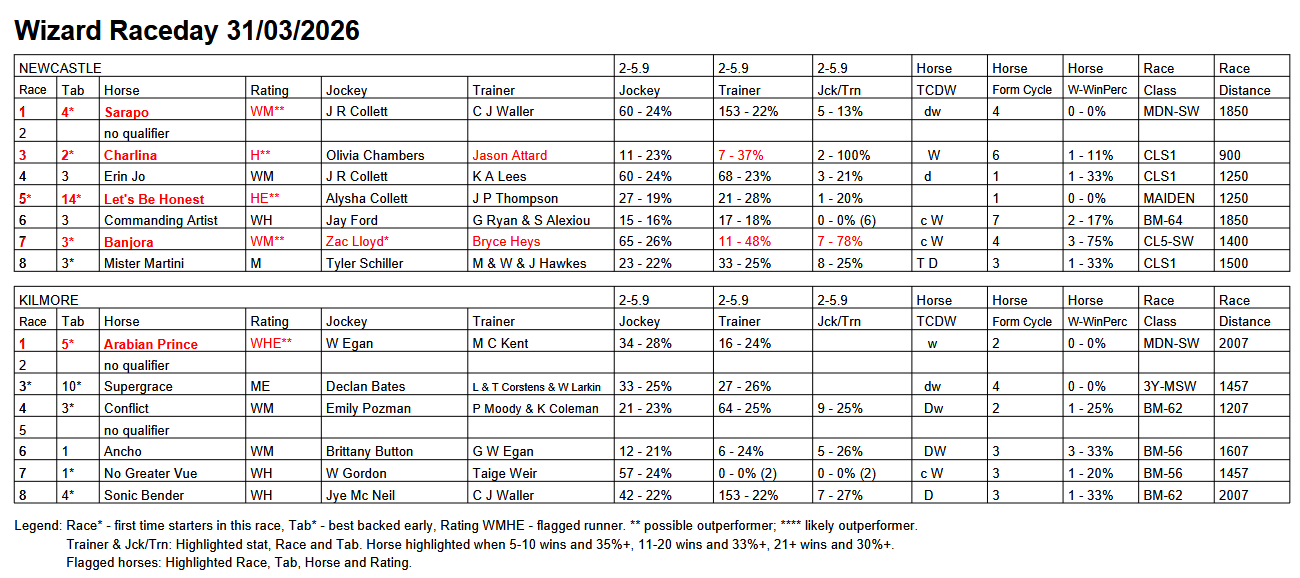 The Wizard publishes on this page one of its Wizard reports or special features, either completely or a part thereof, and today the Wizard Freebie is the Wizard Raceday for two meetings. The full Raceday Report and the other Wizard reports for all meetings are now available to subscribers.