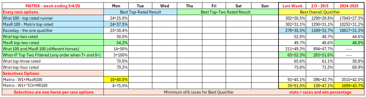 The full day-by-day results for Wizard (Wrat) top 4 rated runners, the Raceday Qualifier, and the Matrix (MaxR) 100 pointer, the MaxR top-two, the What-IF top-two Filtered, together with the Matrix W1+MaxR100 Selective qualifier, and the Matrix W1+*EO+MaxR100 Selective qualifier. Also included are the overall results for last week and the last four weeks. The 2024-2025 column shows the WRat results for the full racing season.
