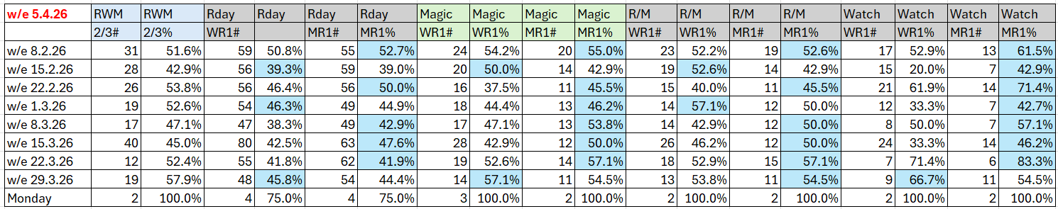 (Key: The first of the two columns for each Selective combination shows number of qualifying races and the second column shows the strike rate. Headings: RWM is Raceday,Watch,Magic, RWM 2/3 means two or three qualifying, Rday is Raceday report qualifier, Magic is Magic report qualifier, R/M is Raceday and Magic, WR1 is Wrat 100, MR1 is MaxR 100.)