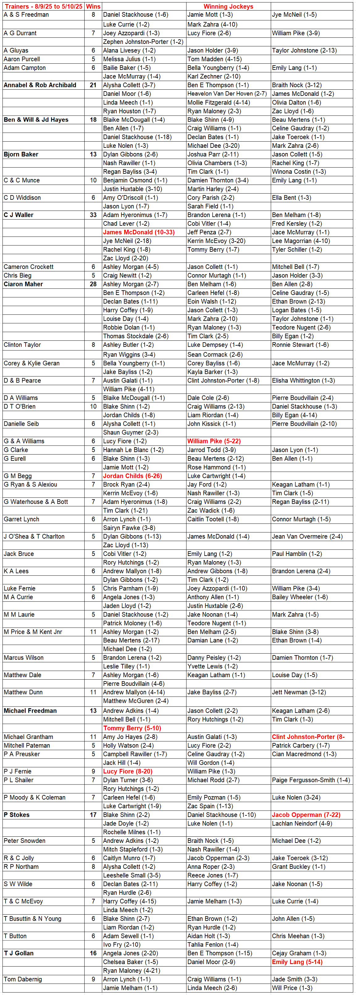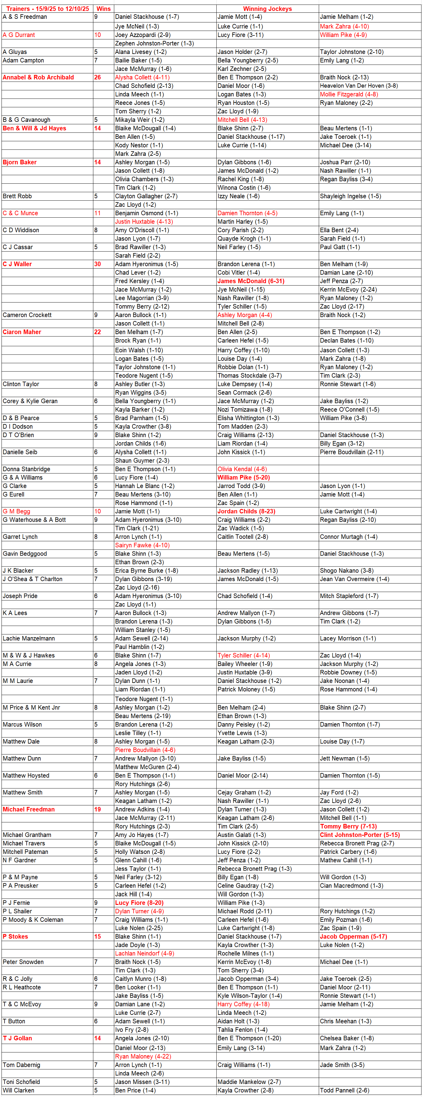 Each Monday I post a table showing the stables that have won at least 5 races over the previous 4 weeks and list the jockeys who rode at least one of those winners, as well as their total rides for the stable, during that period.