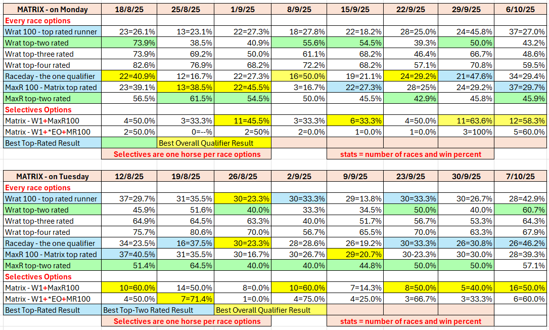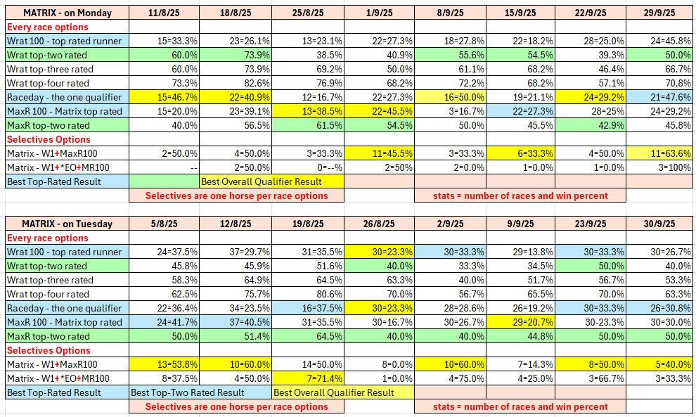 - Matrix - day by day analysis for Monday and Tuesday racing