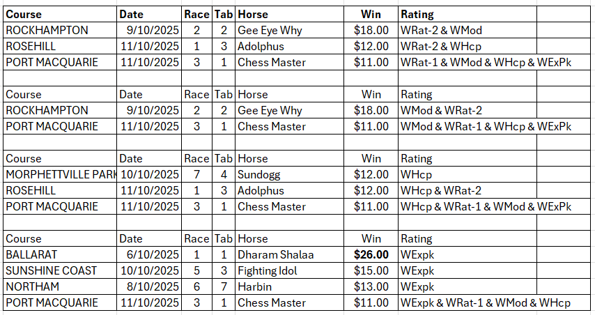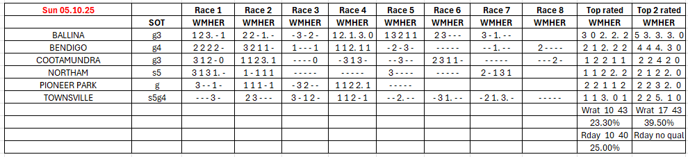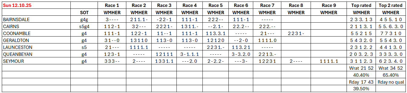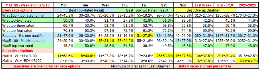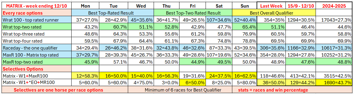 The full day-by-day results for Wizard (Wrat) top 4 rated runners, the Raceday Qualifier, and the Matrix (MaxR) 100 pointer, the MaxR top-two, the Matrix W1+MaxR100 qualifier, and the Matrix W1+*EO+MaxR100 qualifier. Also included are the overall results for last week and the last four weeks. The 2023-2024 column shows the WRat results for the full 2023-2024 racing season. This results summary is colour coded so that it is easier for readers to track the relative performance of the Top Rated (blue) and Top-Two Rated (green) ratings options on a daily, and longer term, basis. The best overall qualifier (yellow) is also highlighted. (The Matrix report is posted to this website between 10:30am and 10:45am, and updated around 12 noon, each day.)