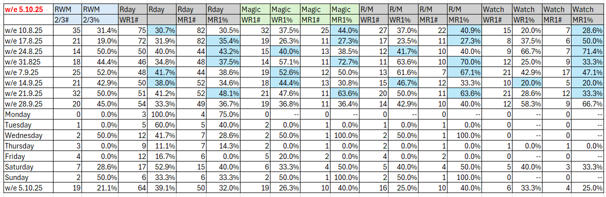The tables show the results for the past eight weeks for the day on which racing occurred. So, today being Monday, this Matrix DOW (Day of Week) report covers the past eight Monday and Tuesday results. The day-after results are included so that they are available on race-eve, rather than only on race morning.