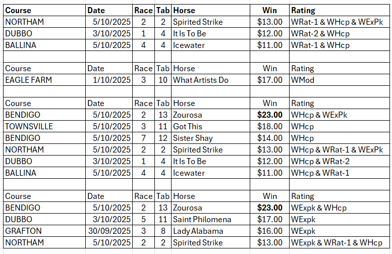 Some of the more notable double-figure winners last week that were top rated on WMod, WHcp, WExpk and/or top-rated (WRat-1) or rated second top (WRat-2):