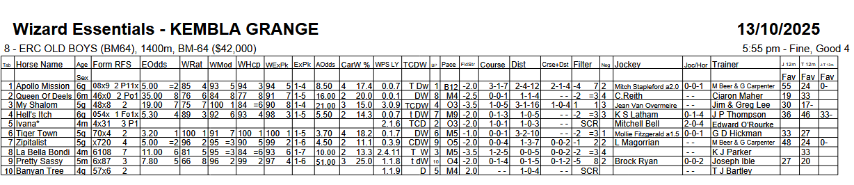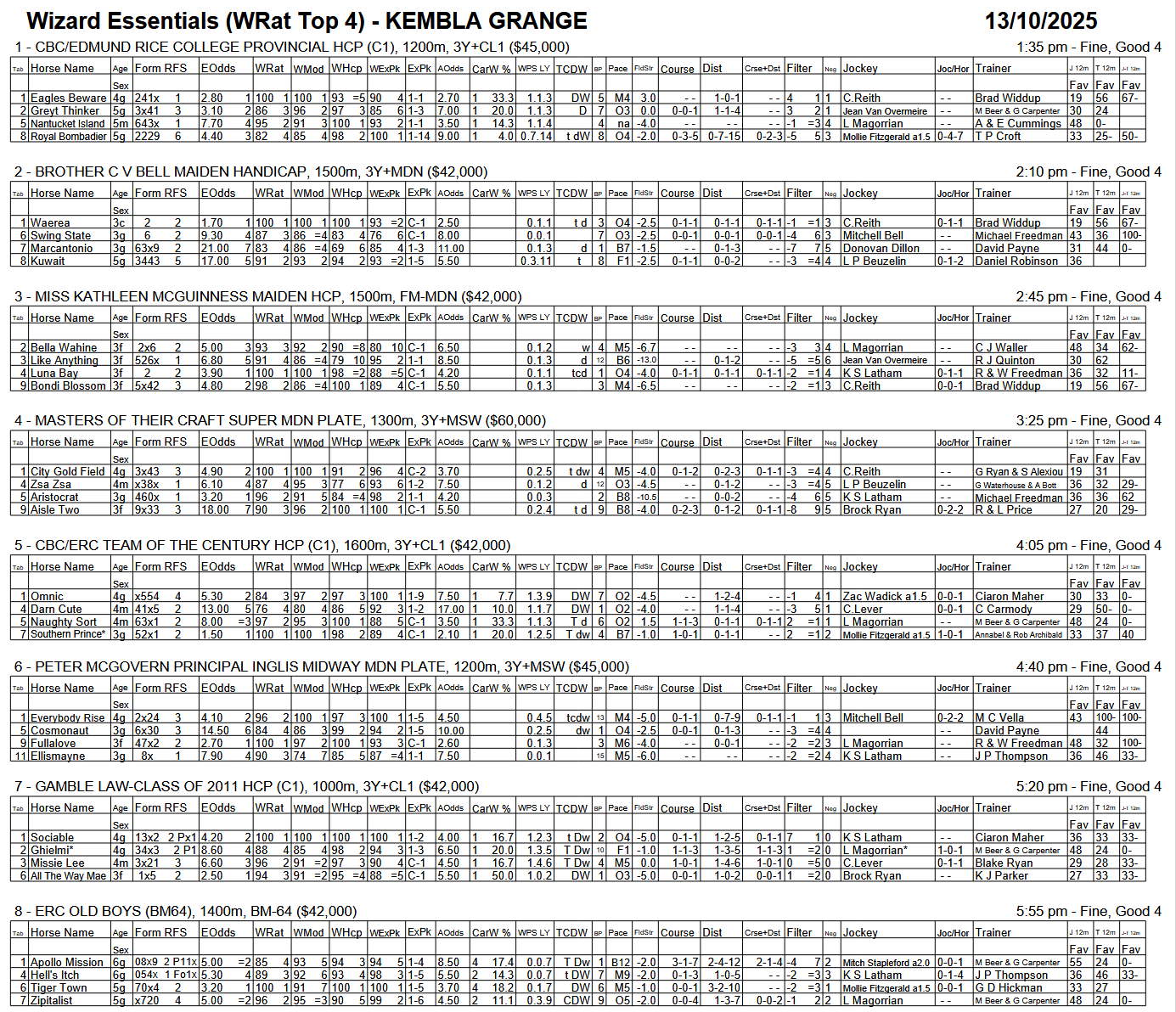 The Wizard Essentials report is a very useful resource, for key data that race handicappers need is at their fingertips. Included are the Wizard's four ratings assessments, each focusing on different time-proven ways of rating runners, and other key (likely) performance indicators, some of which are unique to the Wizard. For example, the Filter and Negatives assessments, the in-running (pace) insights, and form pattern stats (RFS).