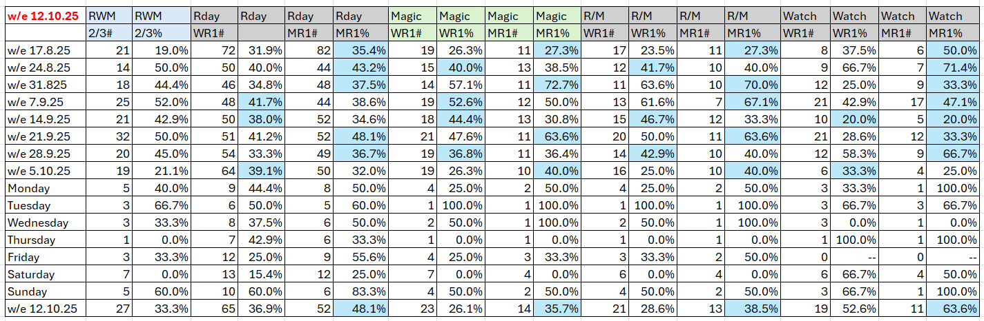 (Key: The first of the two columns for each Selective combination shows number of qualifying races and the second column shows the strike rate. Headings: RWM is Raceday,Watch,Magic, RWM 2/3 means two or three qualifying, Rday is Raceday report qualifier, Magic is Magic report qualifier, R/M is Raceday and Magic, WR1 is Wrat 100, MR1 is MaxR 100.)
