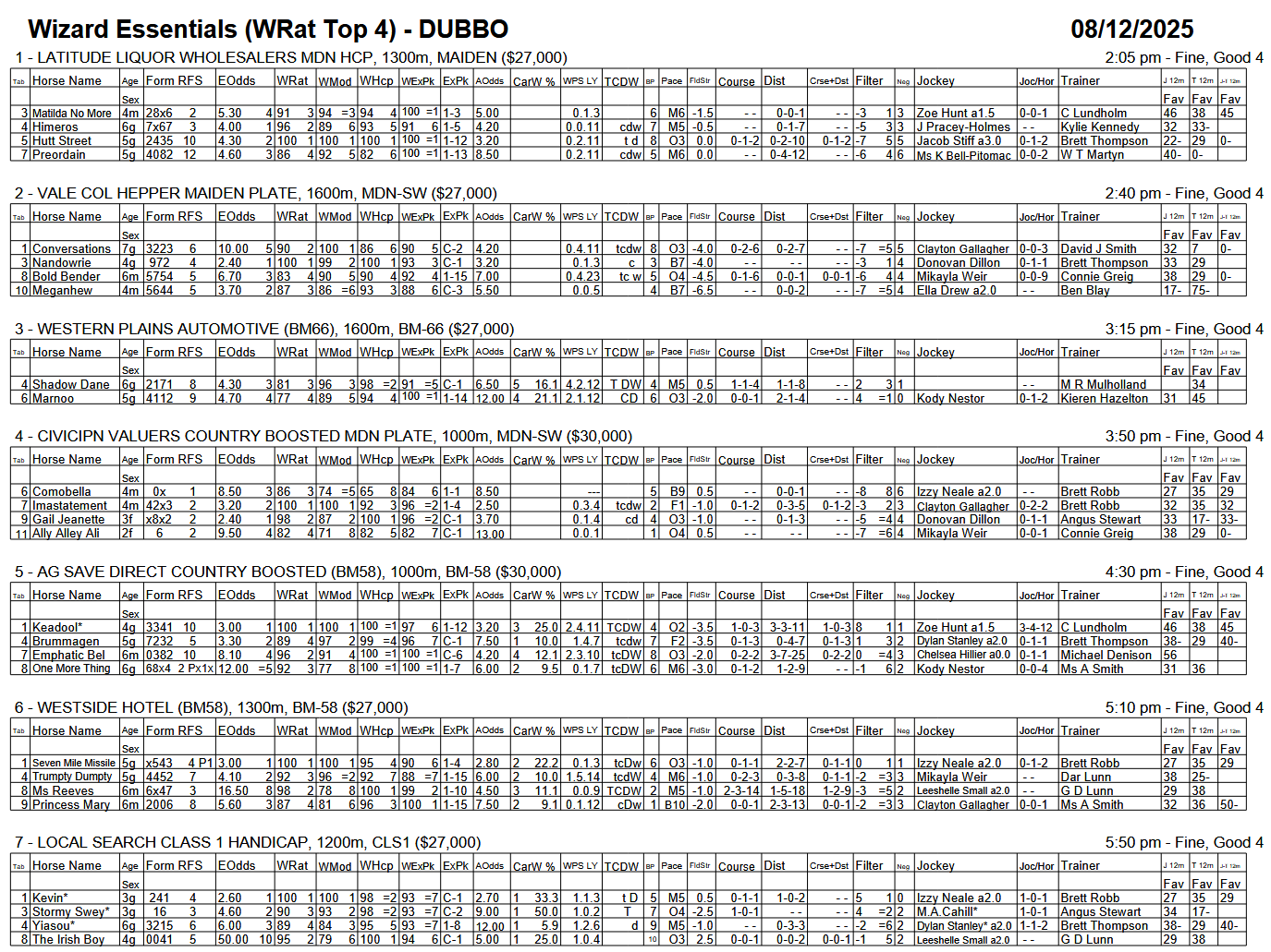 Wizard Ratings, Raceday, Matrix, and Selectives results