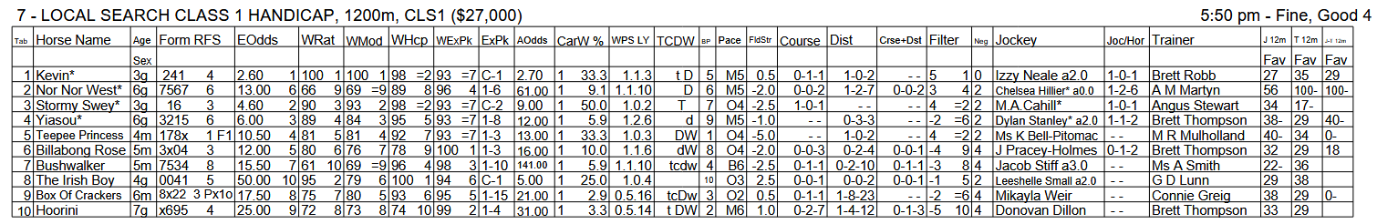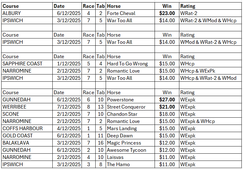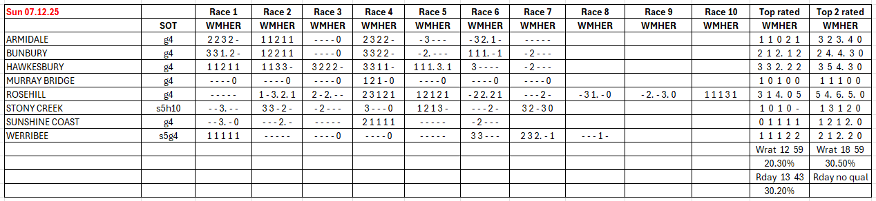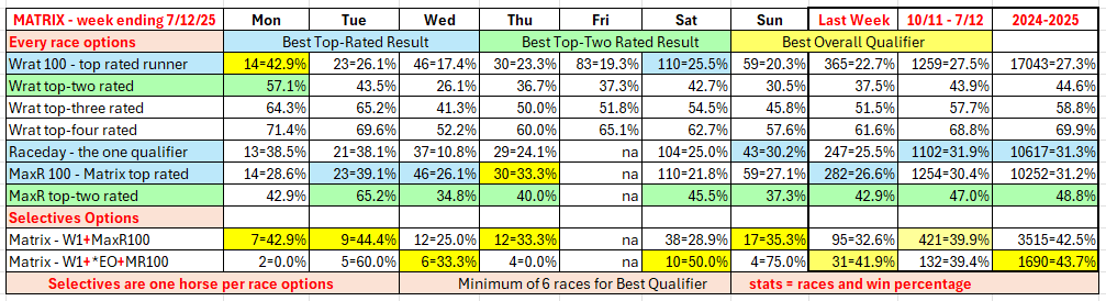 The full day-by-day results for Wizard (Wrat) top 4 rated runners, the Raceday Qualifier, and the Matrix (MaxR) 100 pointer, the MaxR top-two, the Matrix W1+MaxR100 qualifier, and the Matrix W1+*EO+MaxR100 qualifier. Also included are the overall results for last week and the last four weeks. The 2023-2024 column shows the WRat results for the full 2023-2024 racing season. This results summary is colour coded so that it is easier for readers to track the relative performance of the Top Rated (blue) and Top-Two Rated (green) ratings options on a daily, and longer term, basis. The best overall qualifier (yellow) is also highlighted.