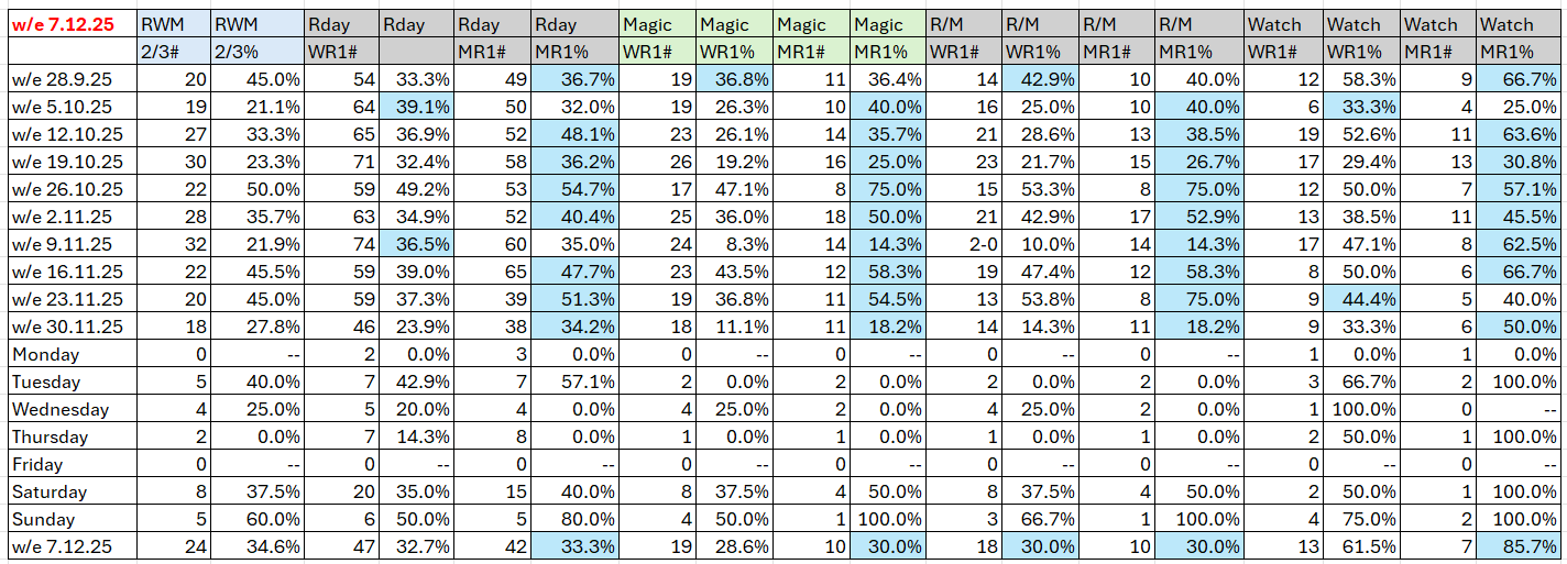 (Key: The first of the two columns for each Selective combination shows number of qualifying races and the second column shows the strike rate. Headings: RWM is Raceday,Watch,Magic, RWM 2/3 means two or three qualifying, Rday is Raceday report qualifier , Magic is Magic report qualifier, R/M is Raceday and Magic, WR1 is Wrat 100, MR1 is MaxR 100.)
