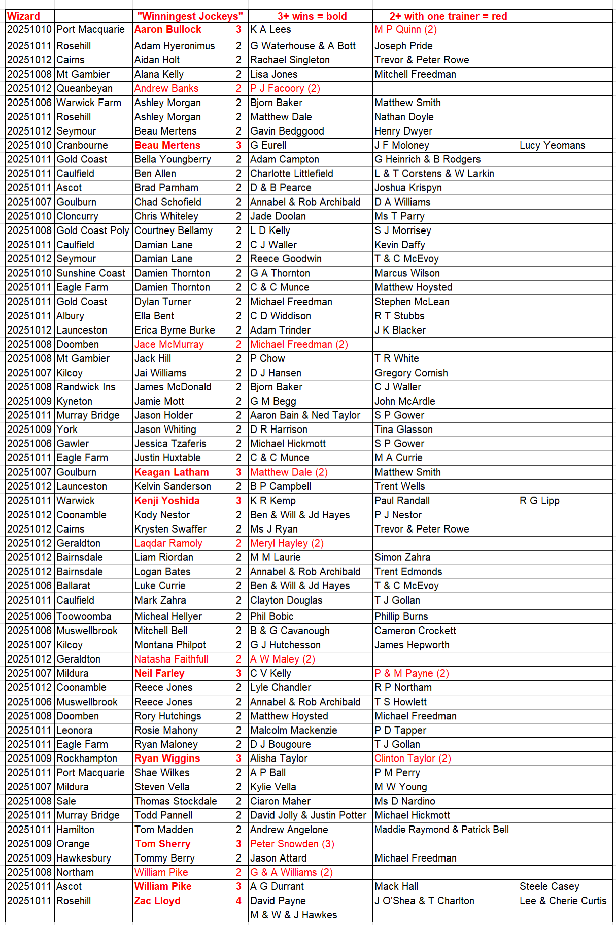 Here is the list of jockeys who rode at least a double at any of the Tab meetings last week, along with the trainers for whom they rode the winners. This table is colour coded to highlight the outperformers and it is definitely worth noting these riders and combinations.
