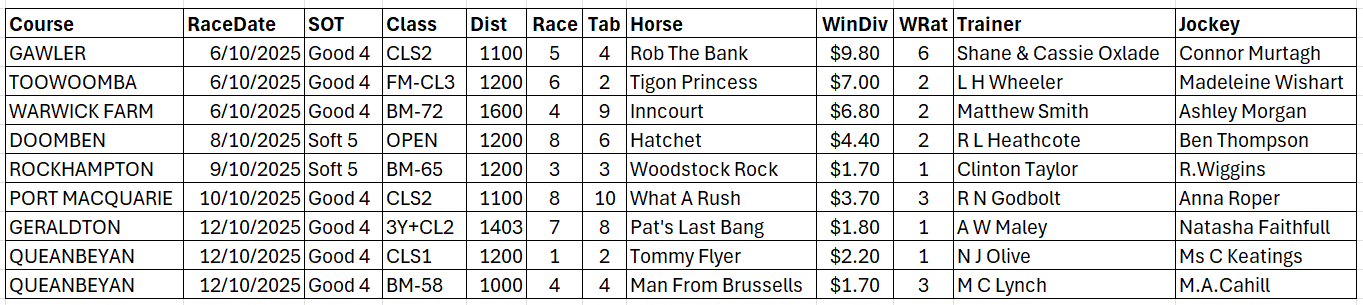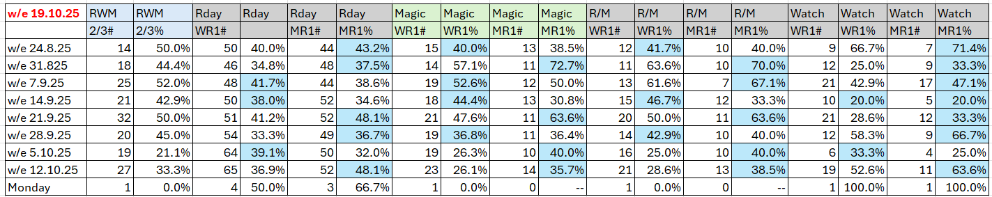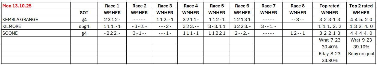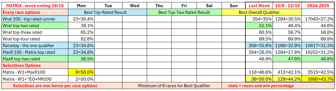 The full day-by-day results for Wizard (Wrat) top 4 rated runners, the Raceday Qualifier, and the Matrix (MaxR) 100 pointer, the MaxR top-two, the Matrix W1+MaxR100 qualifier, and the Matrix W1+*EO+MaxR100 qualifier. The columns also show the overall results for last week and the last four weeks. The 2023-2024 column shows the WRat results for the full 2023-2024 racing season. This results summary is colour coded so that it is easier for readers to track the relative performance of the Top Rated (blue) and Top-Two Rated (green) ratings options on a daily, and longer term, basis. The best overall qualifier (yellow) is also highlighted. (The Matrix report is posted to this website between 10:30am and 10:45am, and updated around 12 noon, each day.)