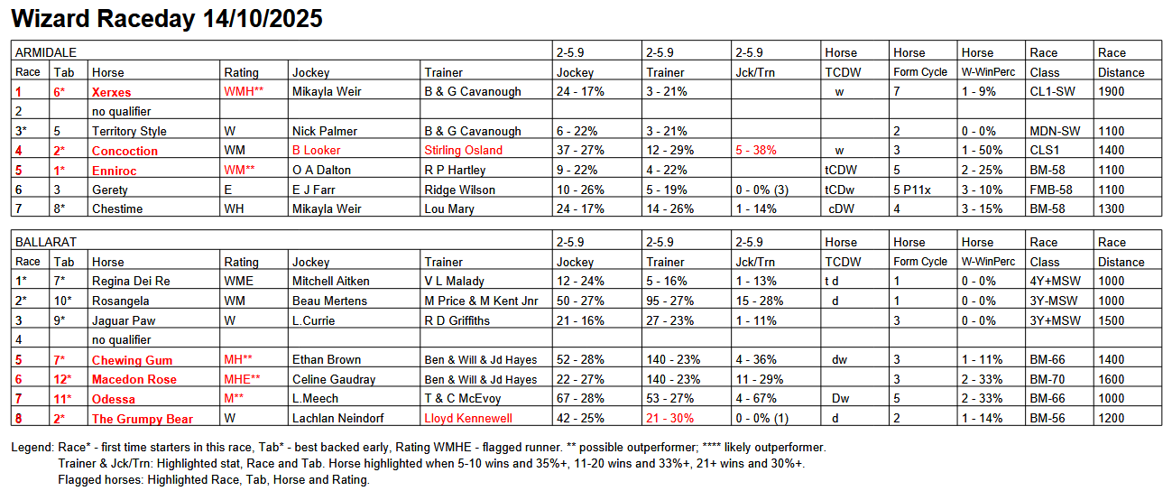 The Wizard publishes on this page one of its Wizard reports or special features, either completely or a part thereof, and today the Wizard Freebie is the Wizard Raceday for two meetings. The full Raceday Report and the other Wizard reports for all meetings are now available to subscribers.