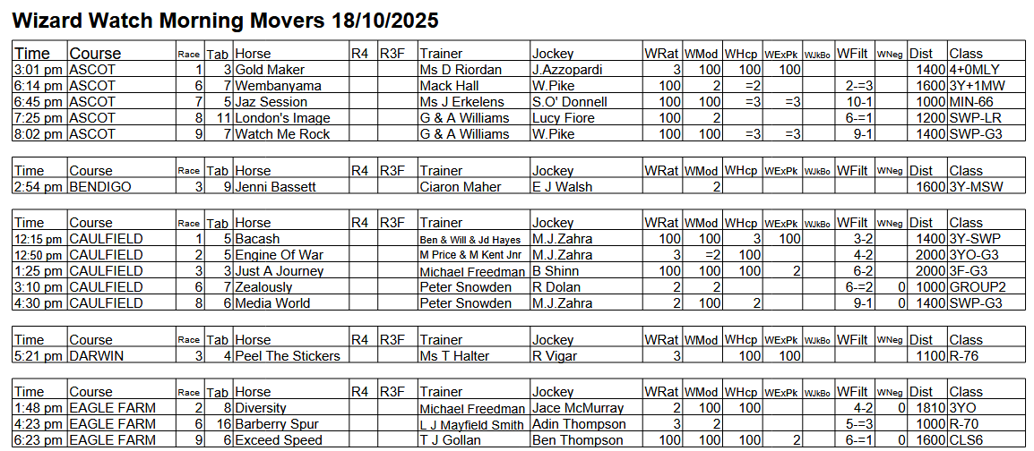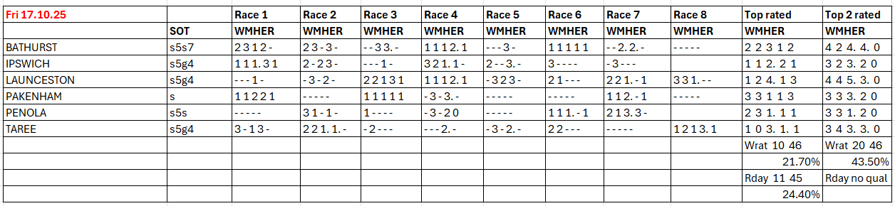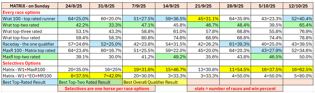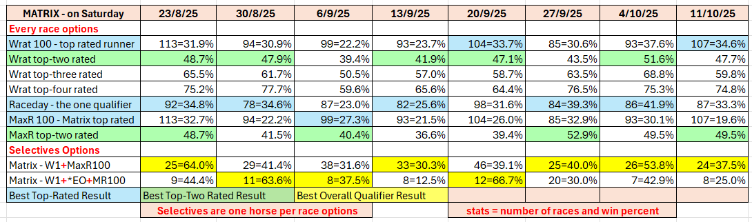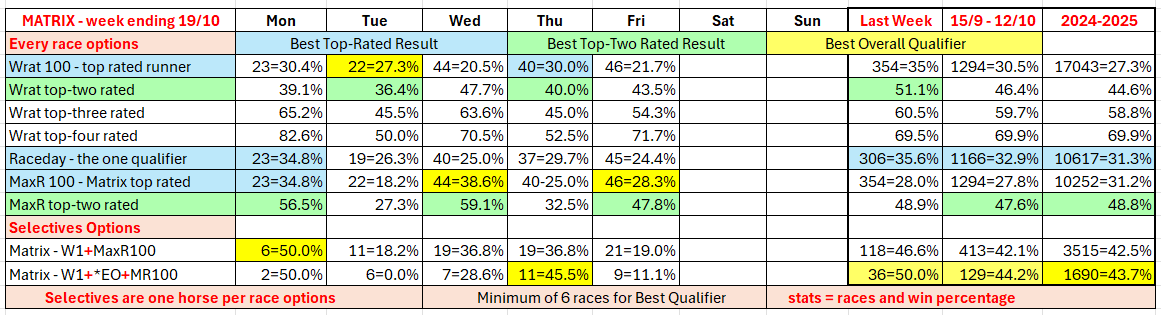 The full day-by-day results for Wizard (Wrat) top 4 rated runners, the Raceday Qualifier, and the Matrix (MaxR) 100 pointer, the MaxR top-two, the Matrix W1+MaxR100 qualifier, and the Matrix W1+*EO+MaxR100 qualifier. Also included are the overall results for last week and the last four weeks. The 2023-2024 column shows the WRat results for the full 2023-2024 racing season. This results summary is colour coded so that it is easier for readers to track the relative performance of the Top Rated (blue) and Top-Two Rated (green) ratings options on a daily, and longer term, basis. The best overall qualifier (yellow) is also highlighted.