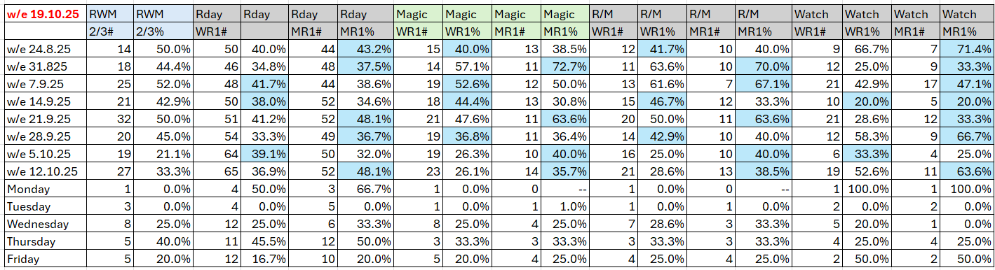 (Key: The first of the two columns for each Selective combination shows number of qualifying races and the second column shows the strike rate. Headings: RWM is Raceday,Watch,Magic, RWM 2/3 means two or three qualifying, Rday is Raceday report qualifier , Magic is Magic report qualifier, R/M is Raceday and Magic, WR1 is Wrat 100, MR1 is MaxR 100.)