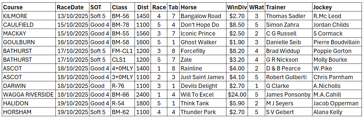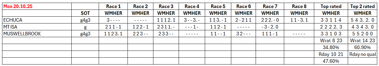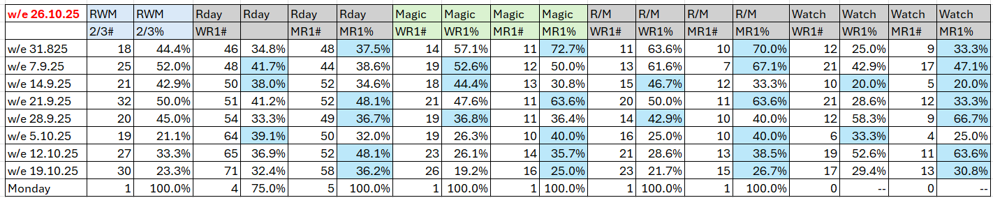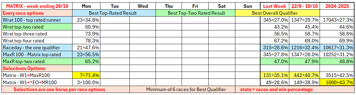 The full day-by-day results for Wizard (Wrat) top 4 rated runners, the Raceday Qualifier, and the Matrix (MaxR) 100 pointer, the MaxR top-two, the Matrix W1+MaxR100 qualifier, and the Matrix W1+*EO+MaxR100 qualifier. The columns also show the overall results for last week and the last four weeks. The 2023-2024 column shows the WRat results for the full 2023-2024 racing season. This results summary is colour coded so that it is easier for readers to track the relative performance of the Top Rated (blue) and Top-Two Rated (green) ratings options on a daily, and longer term, basis. The best overall qualifier (yellow) is also highlighted. (The Matrix report is posted to this website between 10:30am and 10:45am, and updated around 12 noon, each day.)