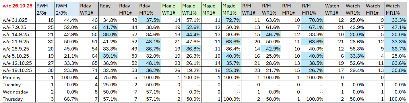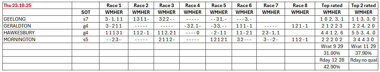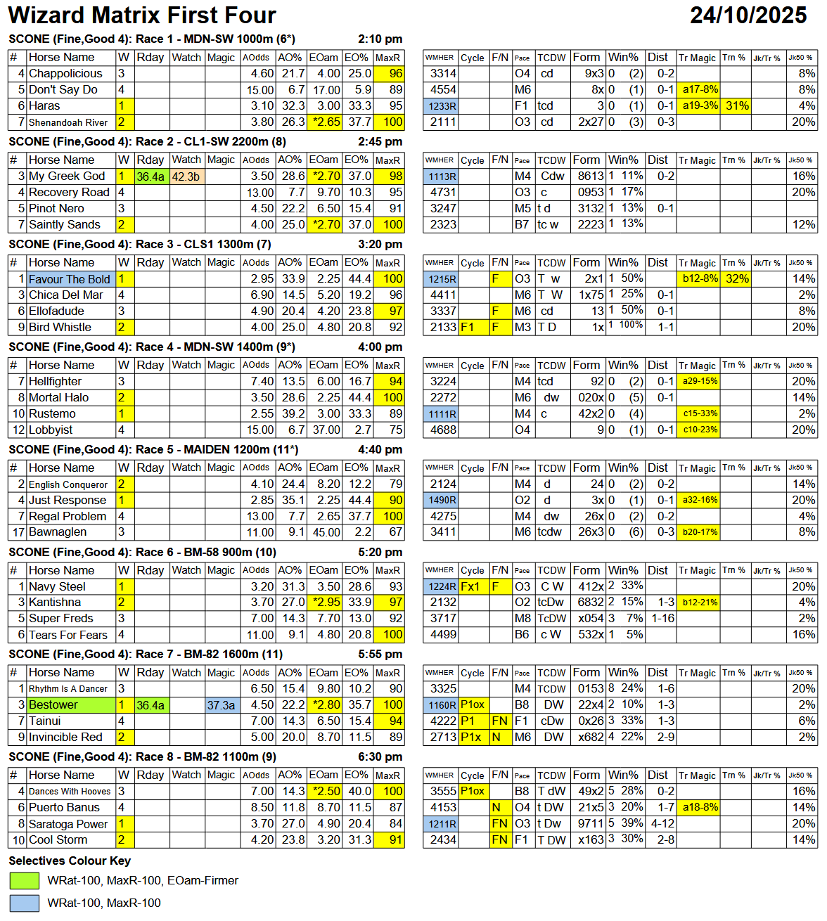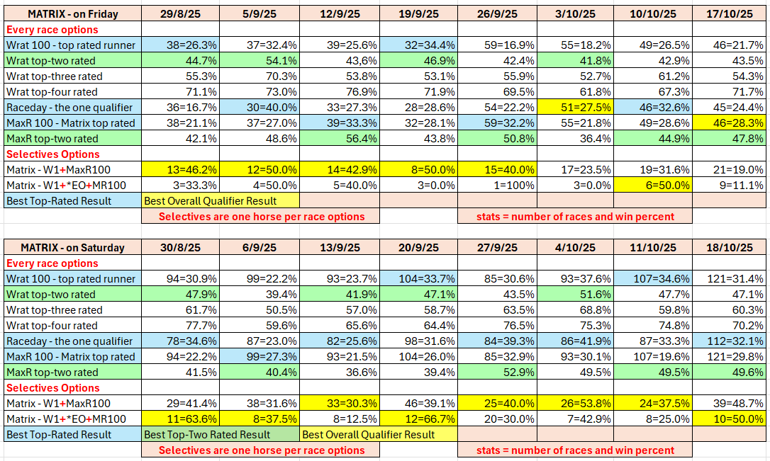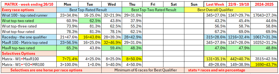 The full day-by-day results for Wizard (Wrat) top 4 rated runners, the Raceday Qualifier, and the Matrix (MaxR) 100 pointer, the MaxR top-two, the Matrix W1+MaxR100 qualifier, and the Matrix W1+*EO+MaxR100 qualifier. Also shown are the overall results for last week and the last four weeks. The 2023-2024 column shows the WRat results for the full 2023-2024 racing season. This results summary is colour coded so that it is easier for readers to track the relative performance of the Top Rated (blue) and Top-Two Rated (green) ratings options on a daily, and longer term, basis. The best overall qualifier (yellow) is also highlighted.