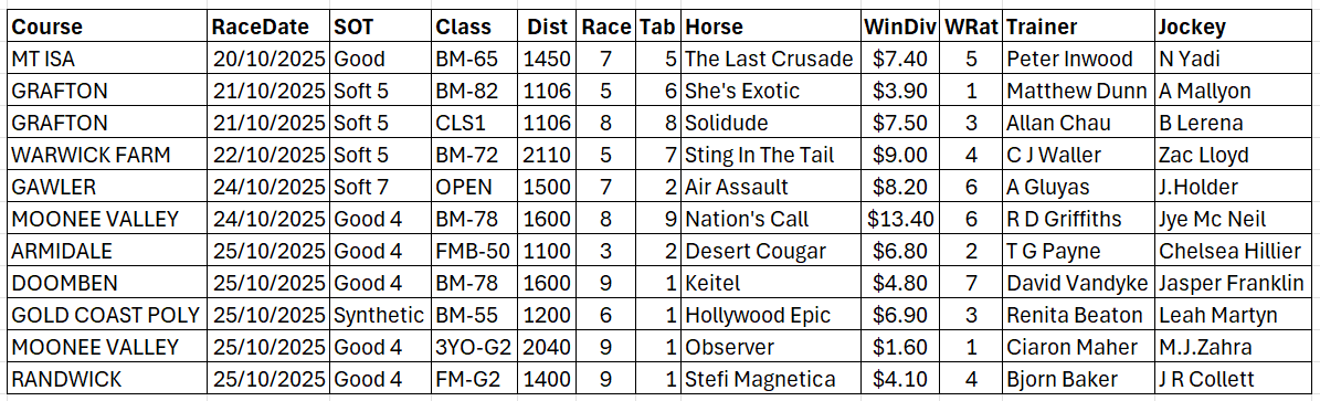 The list below shows the winning horses last week that raced with a (previous) winning jockey replacing a rider who had not previously been successful on the horse.