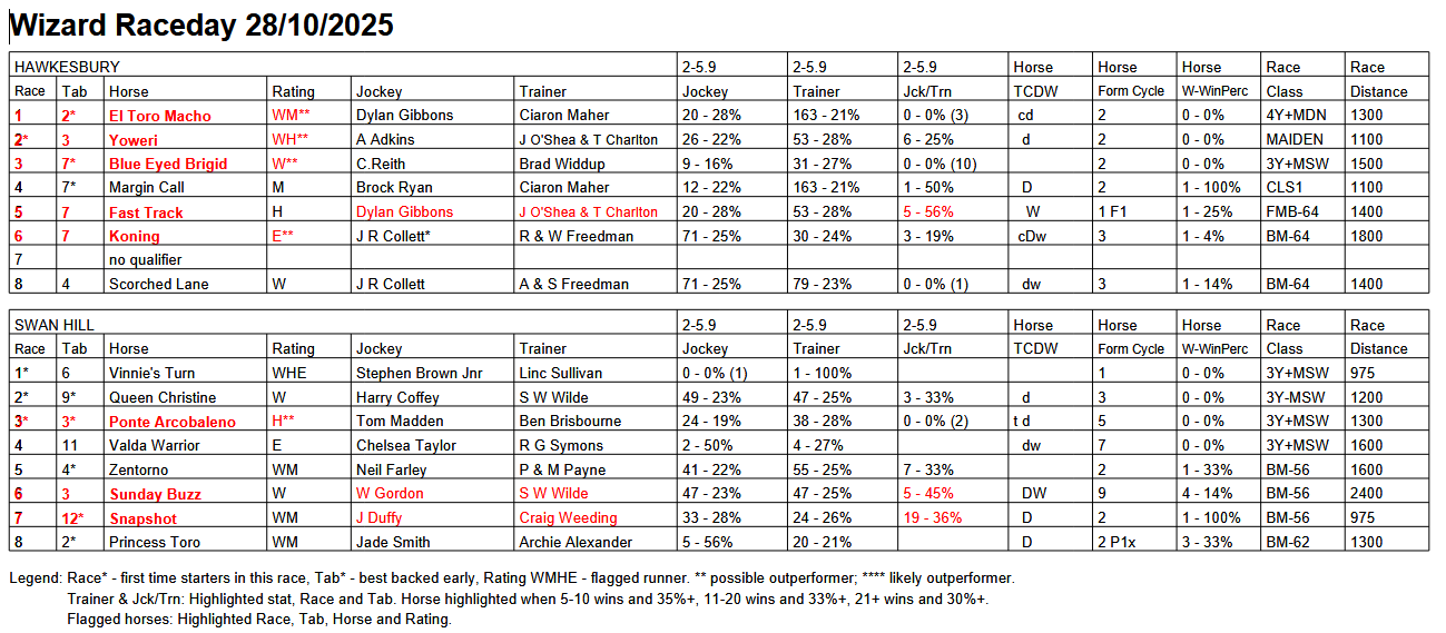 The Wizard publishes on this page one of its Wizard reports or special features, either completely or a part thereof, and today the Wizard Freebie is the Wizard Raceday for two meetings. The full Raceday Report and the other Wizard reports for all meetings are now available to subscribers.