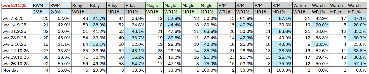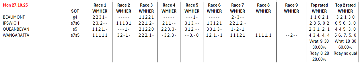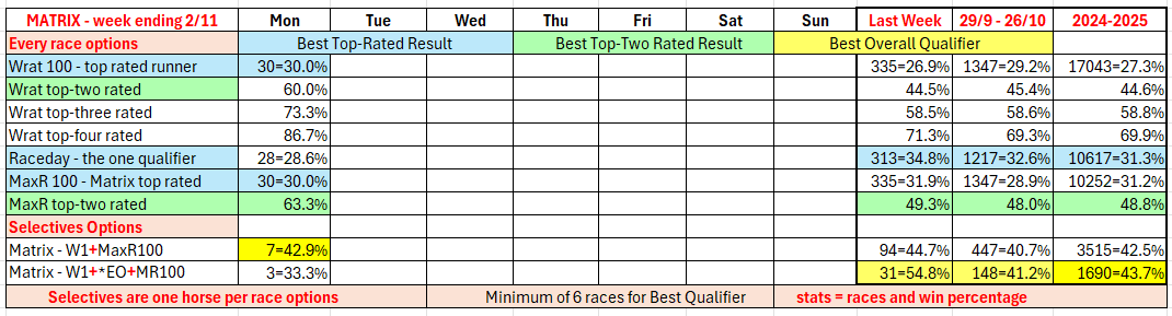 The full day-by-day results for Wizard (Wrat) top 4 rated runners, the Raceday Qualifier, and the Matrix (MaxR) 100 pointer, the MaxR top-two, the Matrix W1+MaxR100 qualifier, and the Matrix W1+*EO+MaxR100 qualifier. The columns also show the overall results for last week and the last four weeks. The 2023-2024 column shows the WRat results for the full 2023-2024 racing season. This results summary is colour coded so that it is easier for readers to track the relative performance of the Top Rated (blue) and Top-Two Rated (green) ratings options on a daily, and longer term, basis. The best overall qualifier (yellow) is also highlighted. (The Matrix report is posted to this website between 10:30am and 10:45am, and updated around 12 noon, each day.)