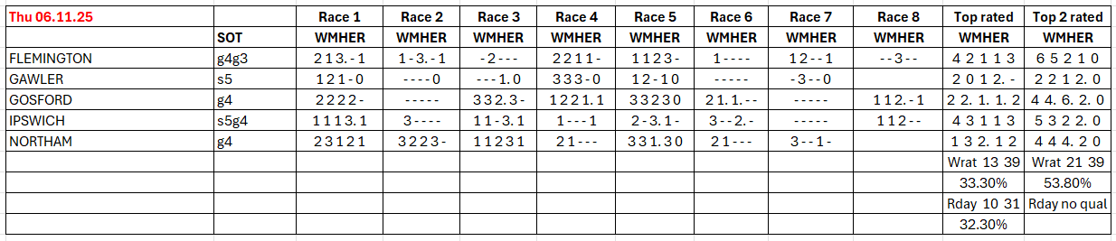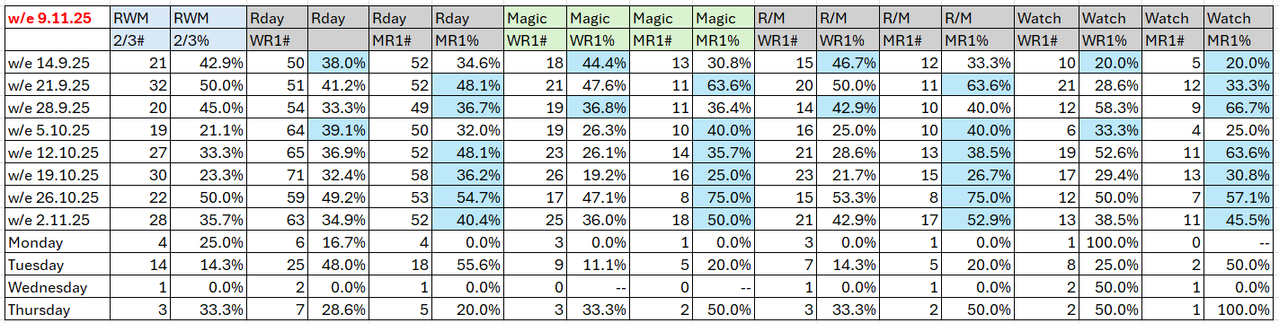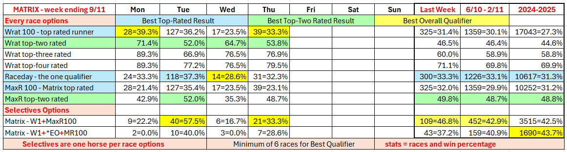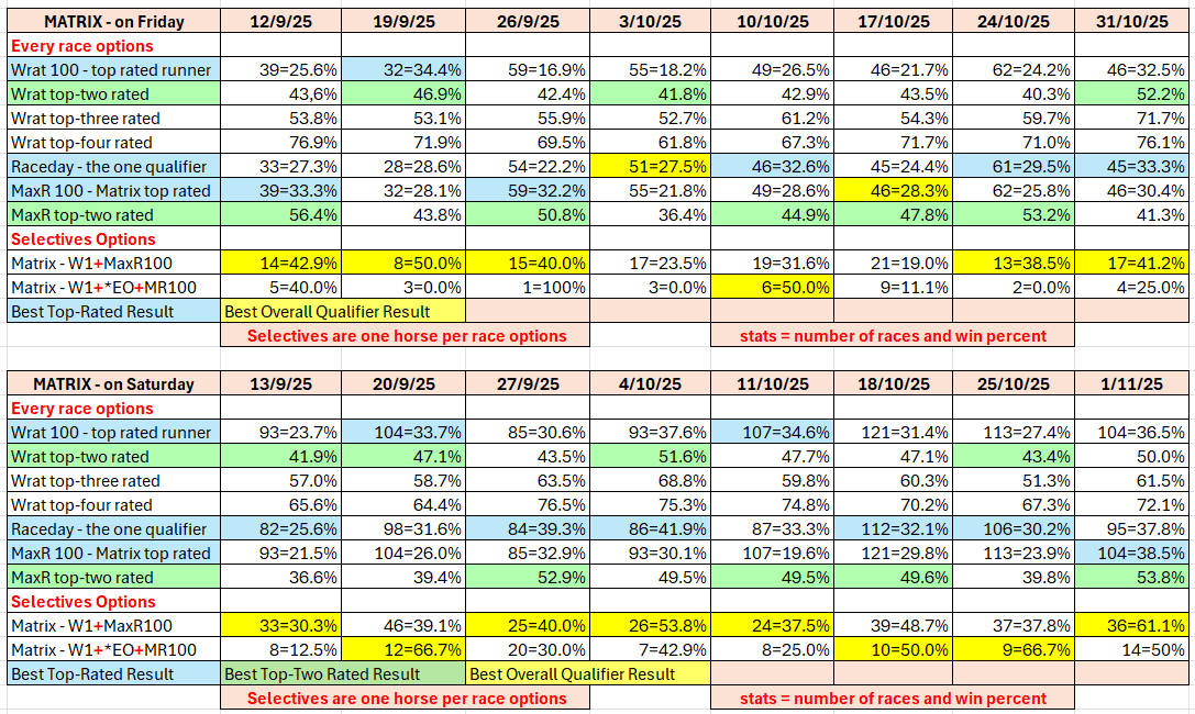 The full day-by-day results for Wizard (Wrat) top 4 rated runners, the Raceday Qualifier, and the Matrix (MaxR) 100 pointer, the MaxR top-two, the Matrix W1+MaxR100 qualifier, and the Matrix W1+*EO+MaxR100 qualifier. Also shown are the overall results for last week and the last four weeks. The 2023-2024 column shows the WRat results for the full 2023-2024 racing season. This results summary is colour coded so that it is easier for readers to track the relative performance of the Top Rated (blue) and Top-Two Rated (green) ratings options on a daily, and longer term, basis. The best overall qualifier (yellow) is also highlighted.