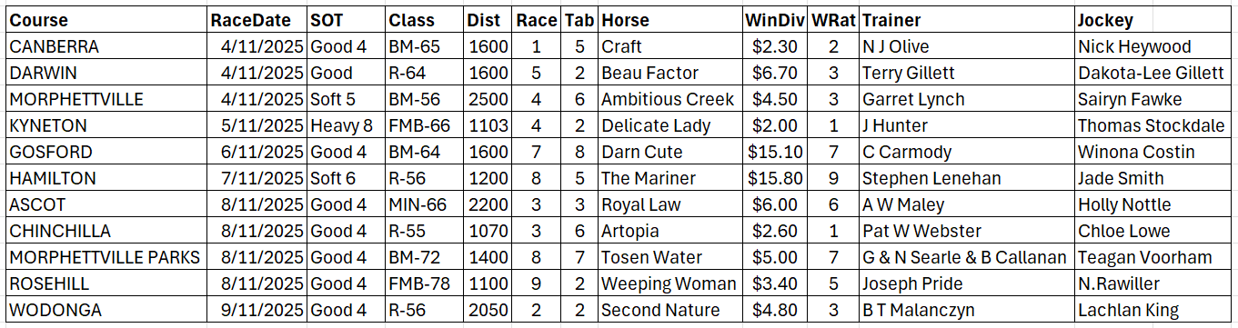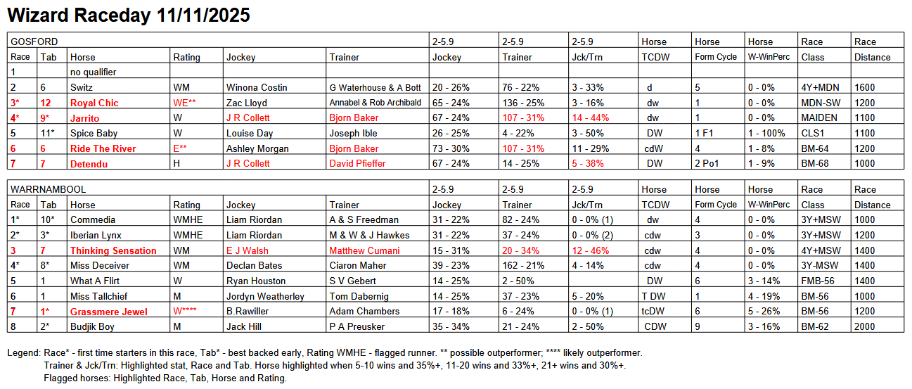 The Wizard publishes on this page one of its Wizard reports or special features, either completely or a part thereof, and today the Wizard Freebie is the Wizard Raceday for two of the four meetings covered. The full Raceday Report and the other Wizard reports for all meetings are now available to subscribers.