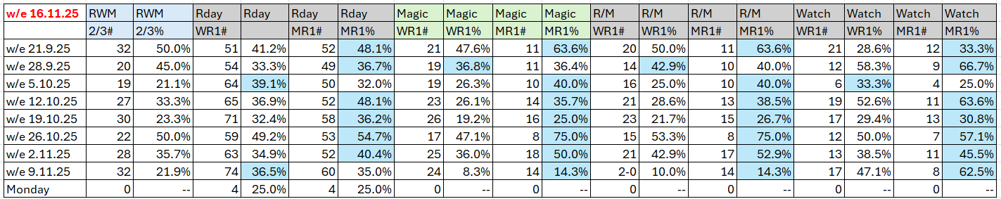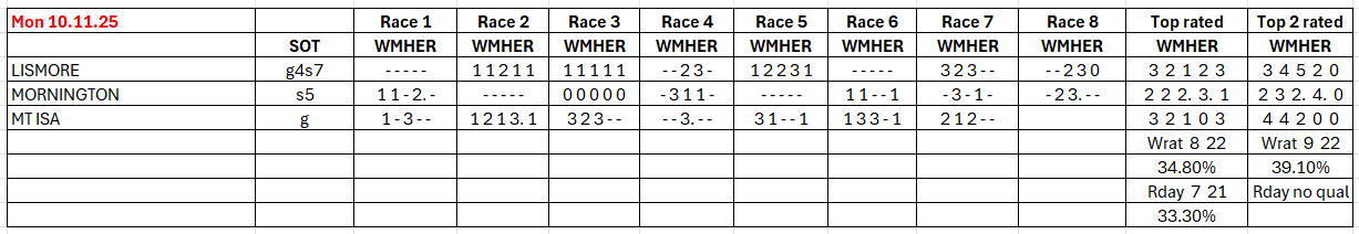 The full day-by-day results for Wizard (Wrat) top 4 rated runners, the Raceday Qualifier, and the Matrix (MaxR) 100 pointer, the MaxR top-two, the Matrix W1+MaxR100 qualifier, and the Matrix W1+*EO+MaxR100 qualifier. The columns also show the overall results for last week and the last four weeks. The 2023-2024 column shows the WRat results for the full 2023-2024 racing season. This results summary is colour coded so that it is easier for readers to track the relative performance of the Top Rated (blue) and Top-Two Rated (green) ratings options on a daily, and longer term, basis. The best overall qualifier (yellow) is also highlighted. (The Matrix report is posted to this website between 10:30am and 10:45am, and updated around 12 noon, each day.)