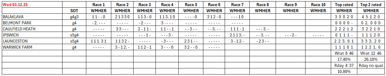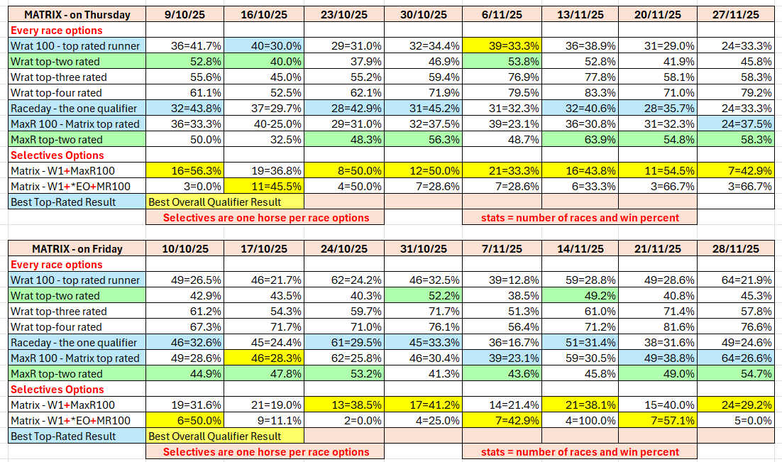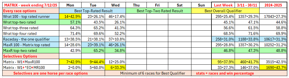 The full day-by-day results for Wizard (Wrat) top 4 rated runners, the Raceday Qualifier, and the Matrix (MaxR) 100 pointer, the MaxR top-two, the Matrix W1+MaxR100 qualifier, and the Matrix W1+*EO+MaxR100 qualifier. Also included are the overall results for last week and the last four weeks. The 2023-2024 column shows the WRat results for the full 2023-2024 racing season. This results summary is colour coded so that it is easier for readers to track the relative performance of the Top Rated (blue) and Top-Two Rated (green) ratings options on a daily, and longer term, basis. The best overall qualifier (yellow) is also highlighted.