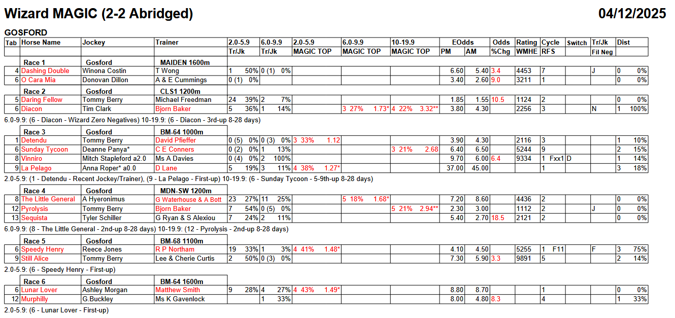 The Magic report is an important component of the Wizard's uniquely successful race-morning MATRIX report whose Selectives consistently outperform traditional rating methodologies.