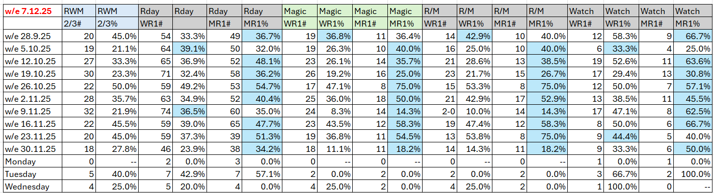 (Key: The first of the two columns for each Selective combination shows number of qualifying races and the second column shows the strike rate. Headings: RWM is Raceday,Watch,Magic, RWM 2/3 means two or three qualifying, Rday is Raceday report qualifier , Magic is Magic report qualifier, R/M is Raceday and Magic, WR1 is Wrat 100, MR1 is MaxR 100.)