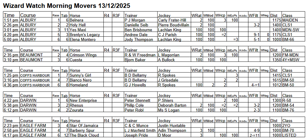 Wizard monitors race morning market trends over the first 3 hours of race day betting to determine which horses are anticipated to run above earlier pre-post expectations and which horses have had their higher probabilities confirmed.