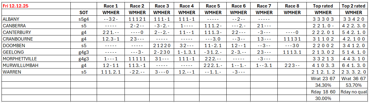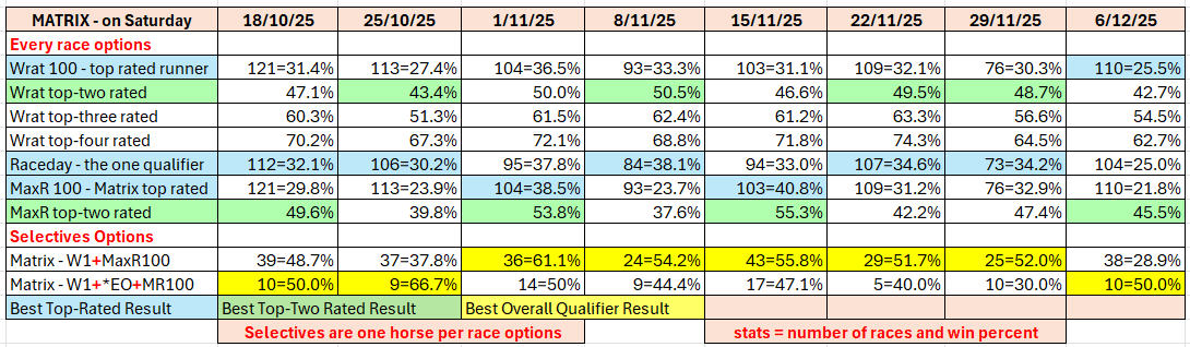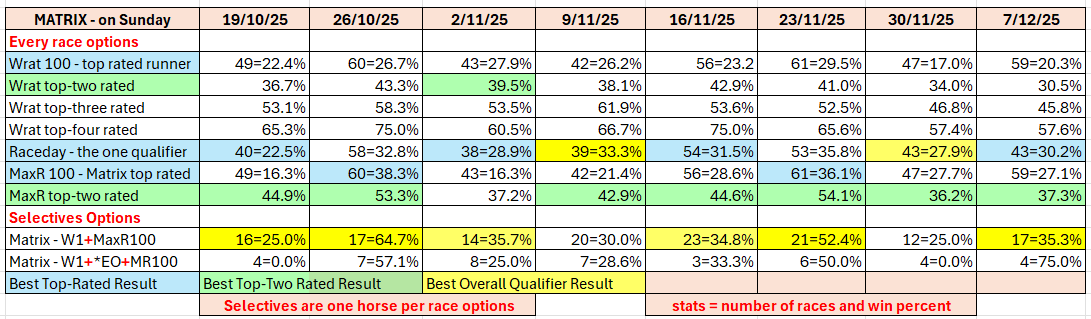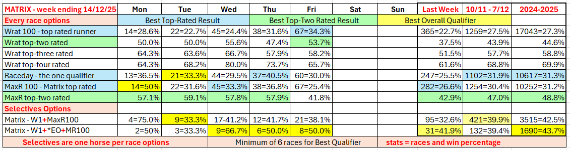 The full day-by-day results for Wizard (Wrat) top 4 rated runners, the Raceday Qualifier, and the Matrix (MaxR) 100 pointer, the MaxR top-two, the Matrix W1+MaxR100 qualifier, and the Matrix W1+*EO+MaxR100 qualifier. Also included are the overall results for last week and the last four weeks. The 2023-2024 column shows the WRat results for the full 2023-2024 racing season. This results summary is colour coded so that it is easier for readers to track the relative performance of the Top Rated (blue) and Top-Two Rated (green) ratings options on a daily, and longer term, basis. The best overall qualifier (yellow) is also highlighted.