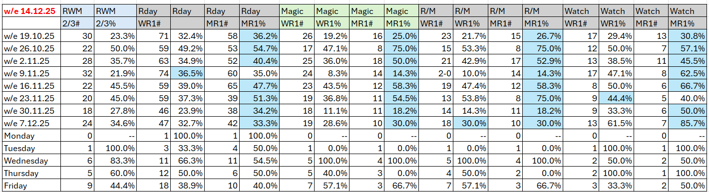 (Key: The first of the two columns for each Selective combination shows number of qualifying races and the second column shows the strike rate. Headings: RWM is Raceday,Watch,Magic, RWM 2/3 means two or three qualifying, Rday is Raceday report qualifier , Magic is Magic report qualifier, R/M is Raceday and Magic, WR1 is Wrat 100, MR1 is MaxR 100.)