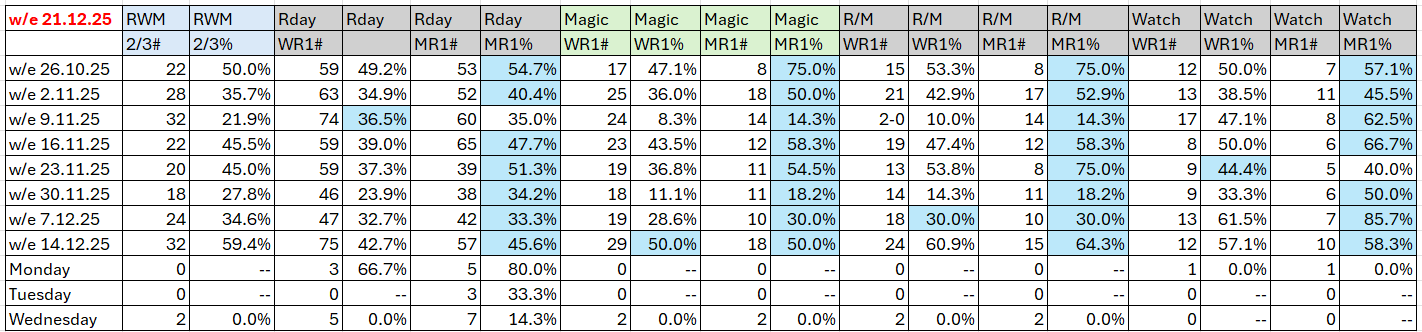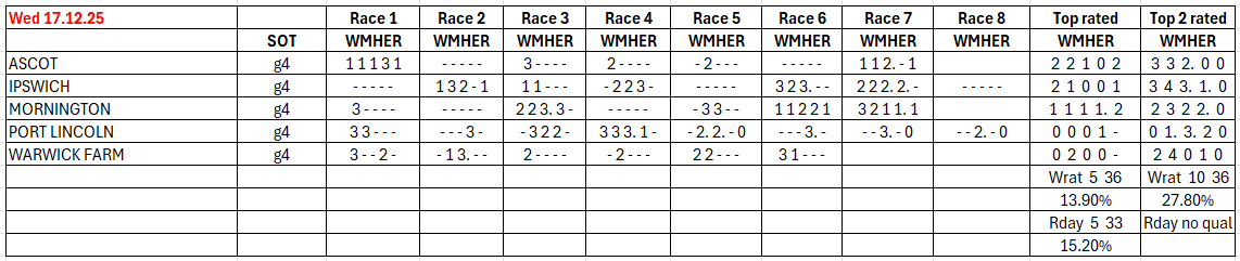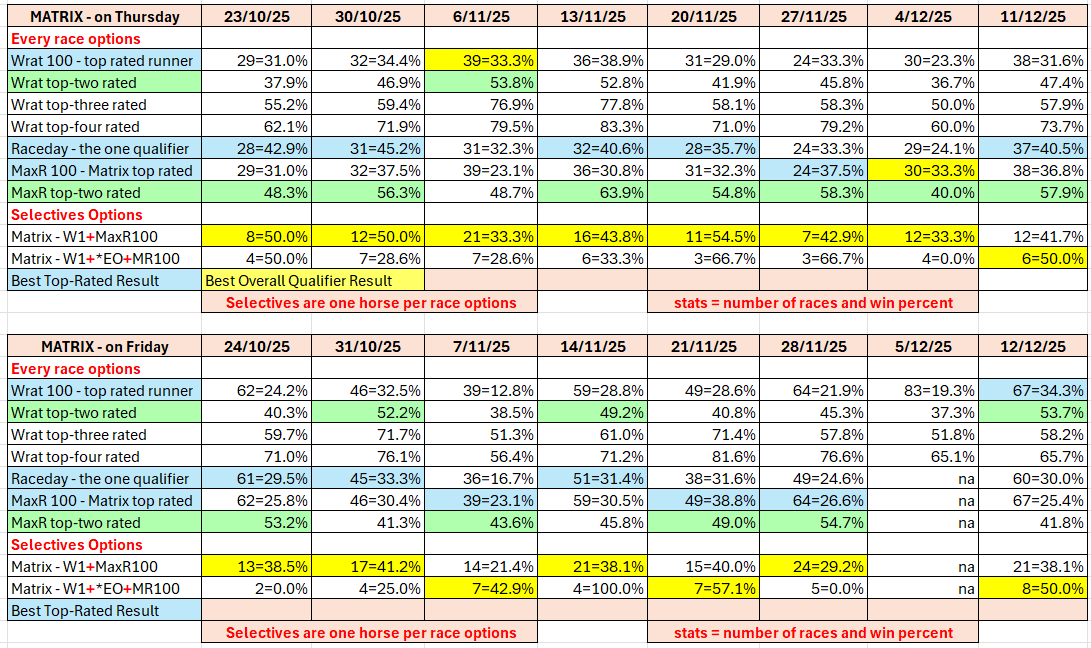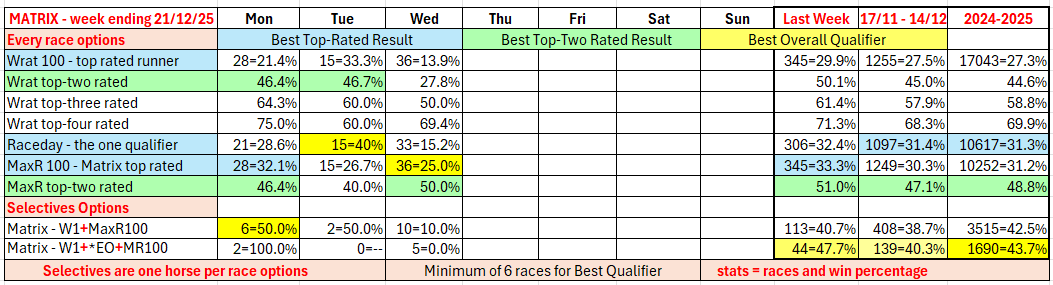 The full day-by-day results for Wizard (Wrat) top 4 rated runners, the Raceday Qualifier, and the Matrix (MaxR) 100 pointer, the MaxR top-two, the Matrix W1+MaxR100 qualifier, and the Matrix W1+*EO+MaxR100 qualifier. Also included are the overall results for last week and the last four weeks. The 2023-2024 column shows the WRat results for the full 2023-2024 racing season. This results summary is colour coded so that it is easier for readers to track the relative performance of the Top Rated (blue) and Top-Two Rated (green) ratings options on a daily, and longer term, basis. The best overall qualifier (yellow) is also highlighted.
