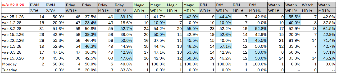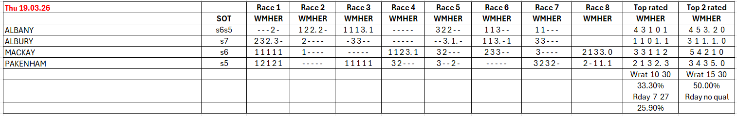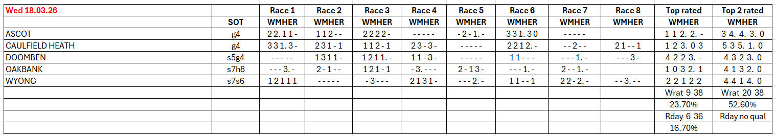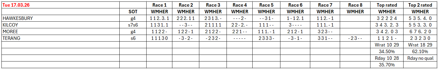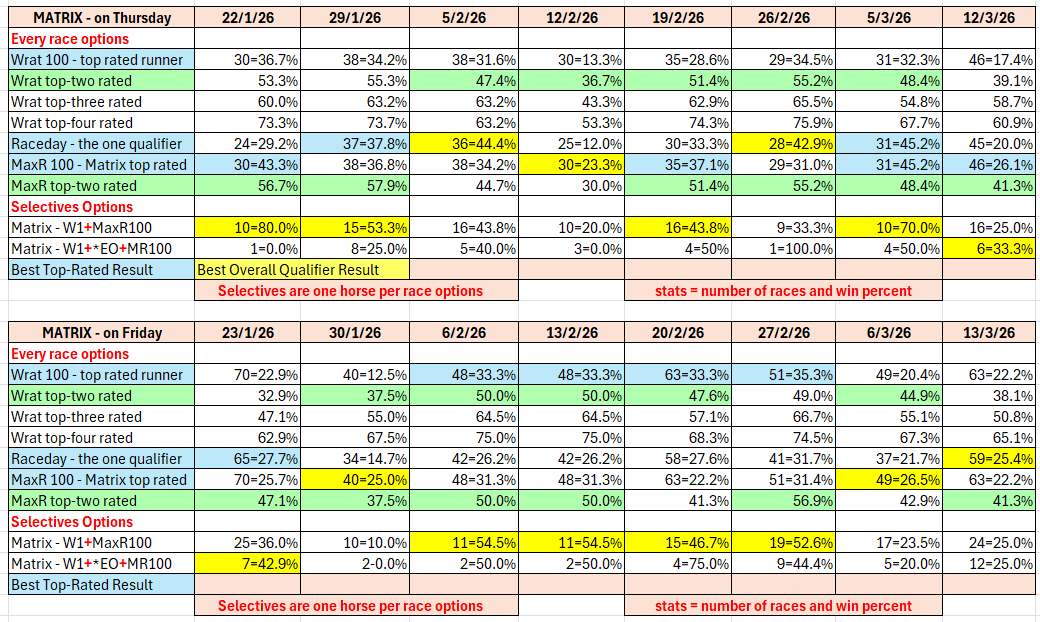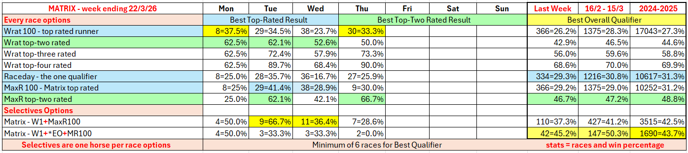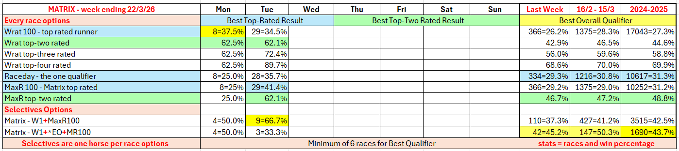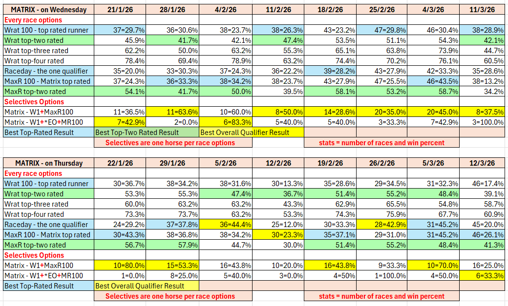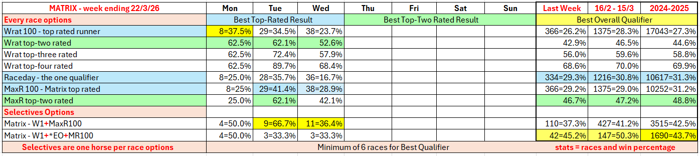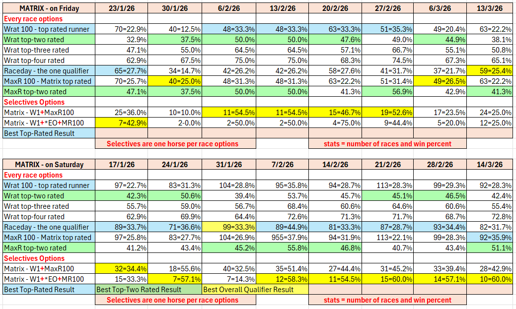 The full day-by-day results for Wizard (Wrat) top 4 rated runners, the Raceday Qualifier, and the Matrix (MaxR) 100 pointer, the MaxR top-two, the Matrix W1+MaxR100 qualifier, and the Matrix W1+*EO+MaxR100 qualifier. Also included are the overall results for last week and the last four weeks. The 2023-2024 column shows the WRat results for the full 2023-2024 racing season. This results summary is colour coded so that it is easier for readers to track the relative performance of the Top Rated (blue) and Top-Two Rated (green) ratings options on a daily, and longer term, basis. The best overall qualifier (yellow) is also highlighted.