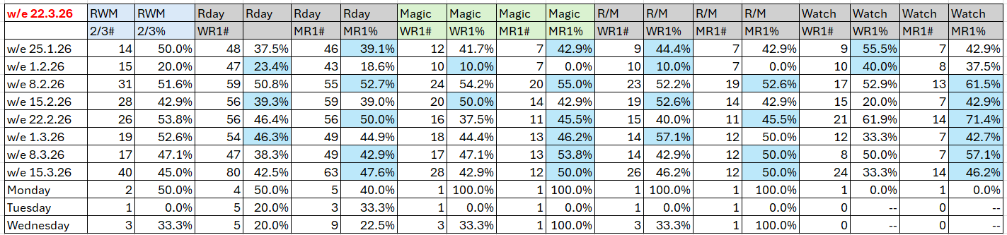 (Key: The first of the two columns for each Selective combination shows number of qualifying races and the second column shows the strike rate. Headings: RWM is Raceday,Watch,Magic,  RWM 2/3 means two or three qualifying, Rday is Raceday report qualifier , Magic is Magic report qualifier, R/M is Raceday and Magic, WR1 is Wrat 100, MR1 is MaxR 100.)