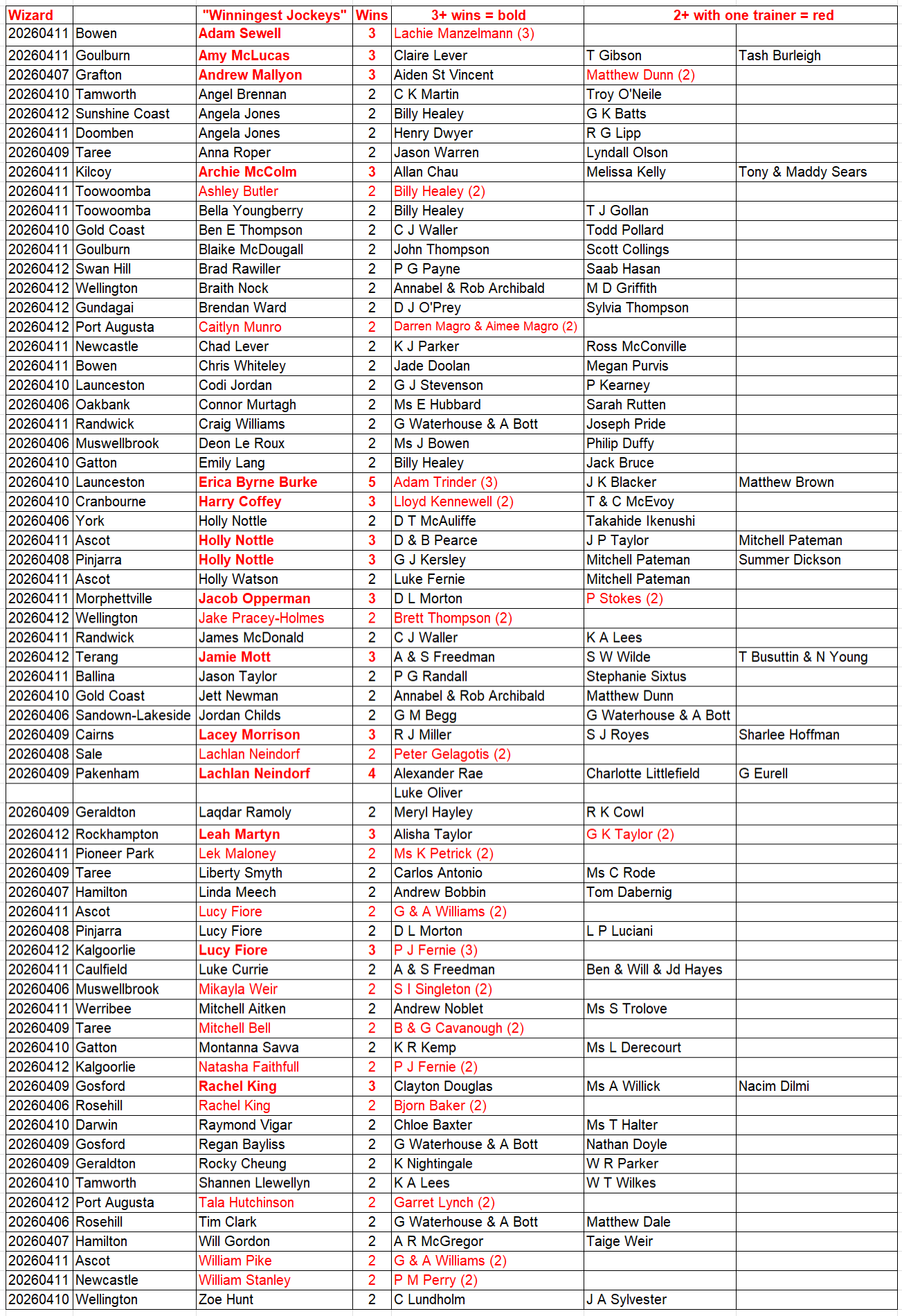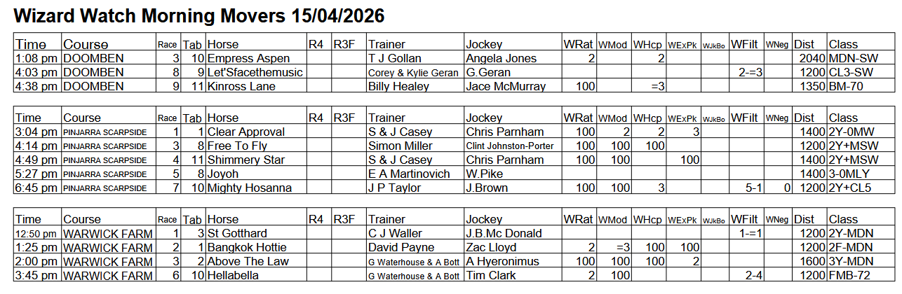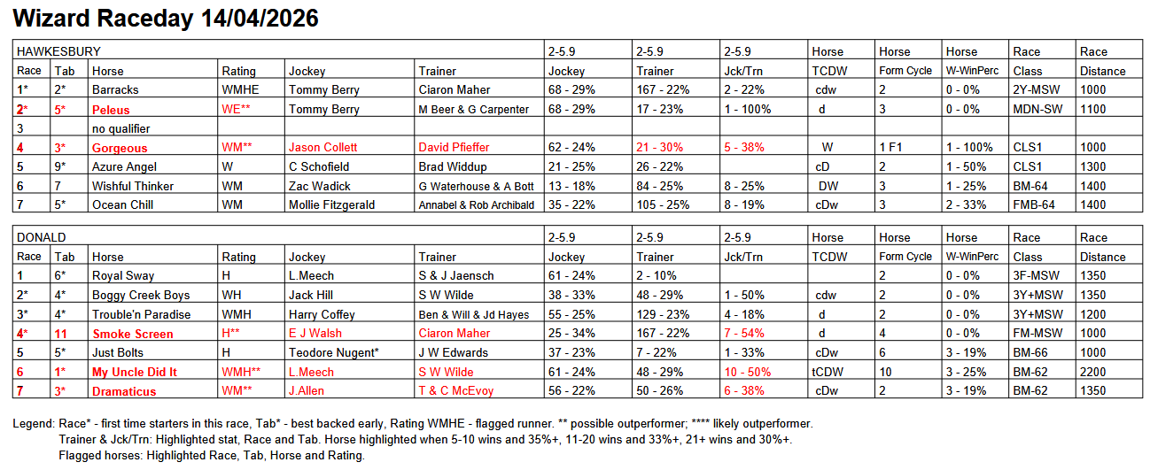 Wizard Ratings, Raceday, Matrix, and Selectives results