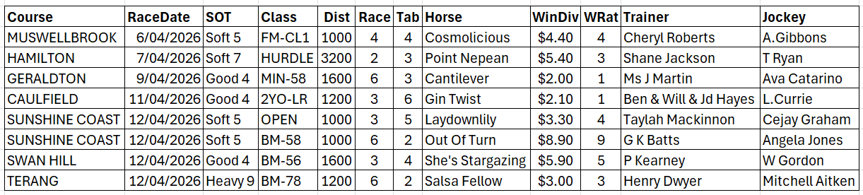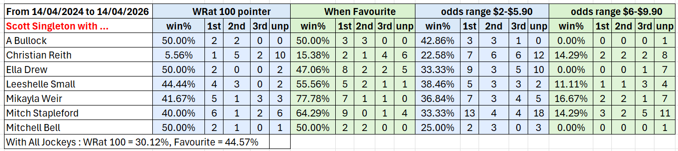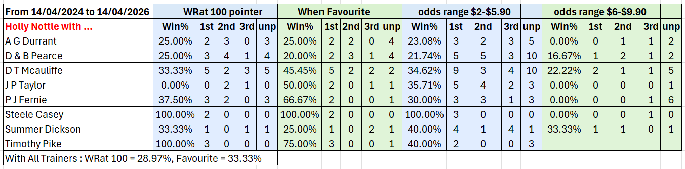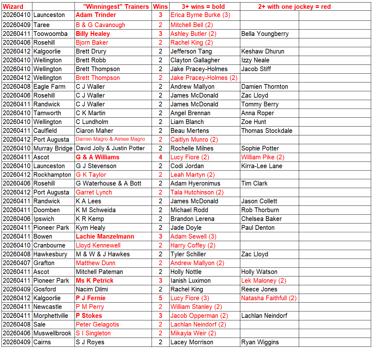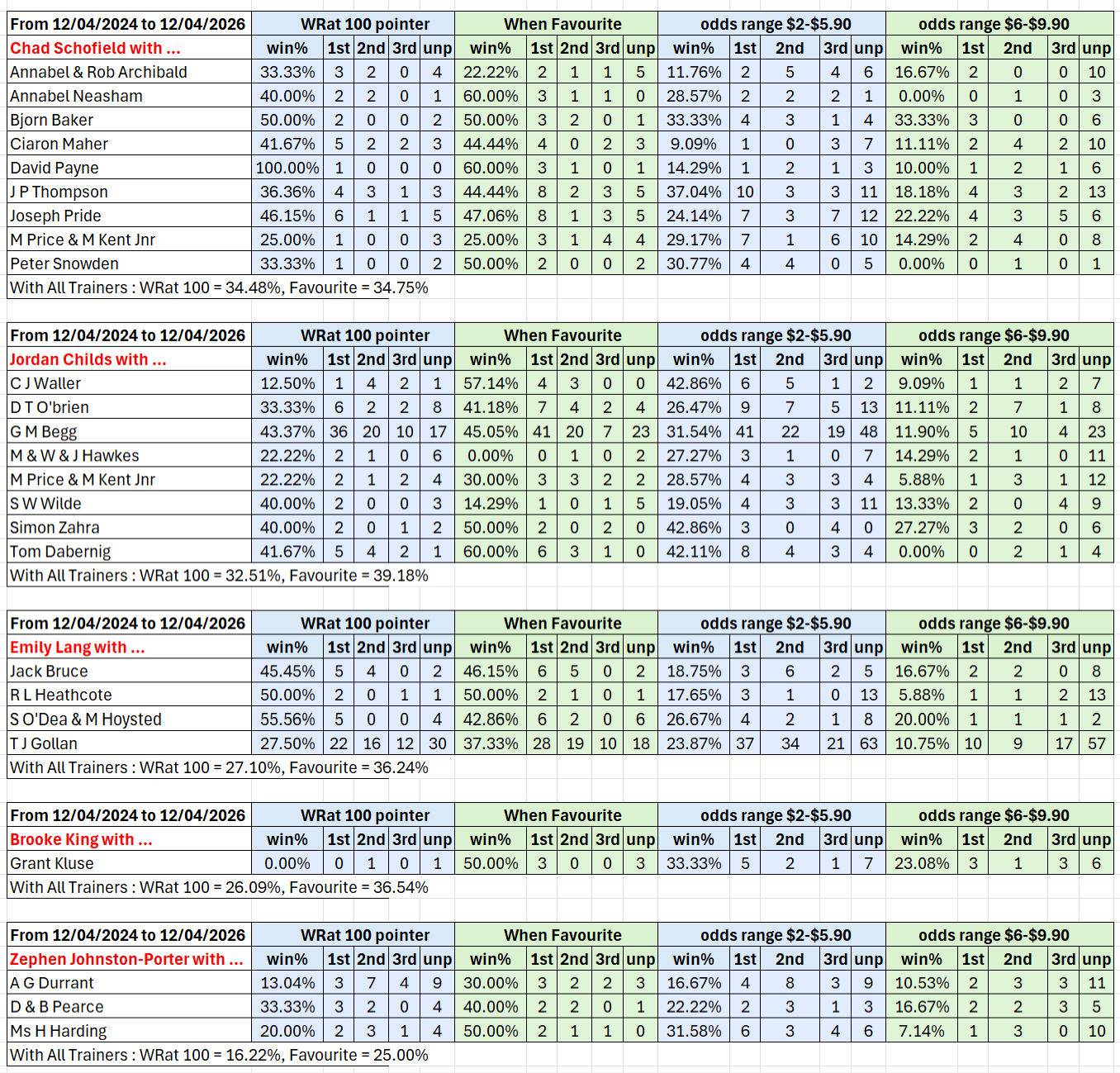 Here is the list of trainers who trained at least a double at any of the Tab meetings last week, along with the jockeys for who rode the winners. This table is colour coded to highlight the outperformers and it is worth noting these stables and the combinations.