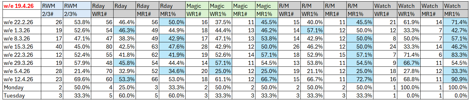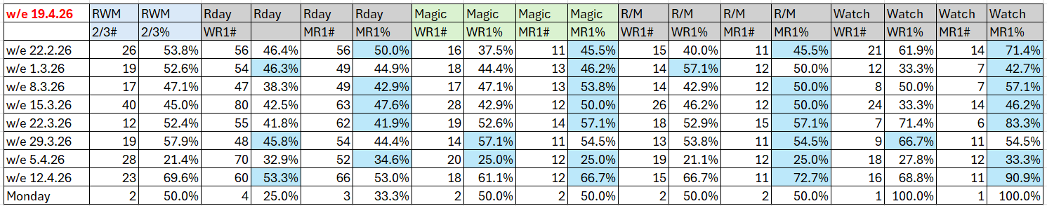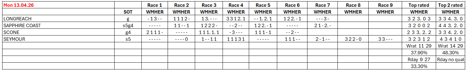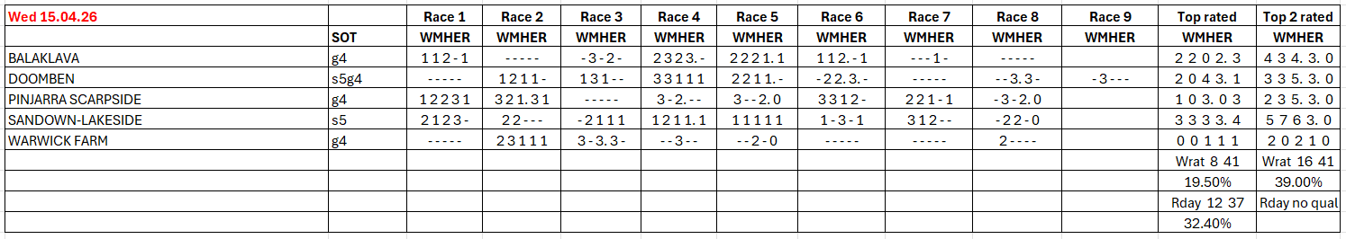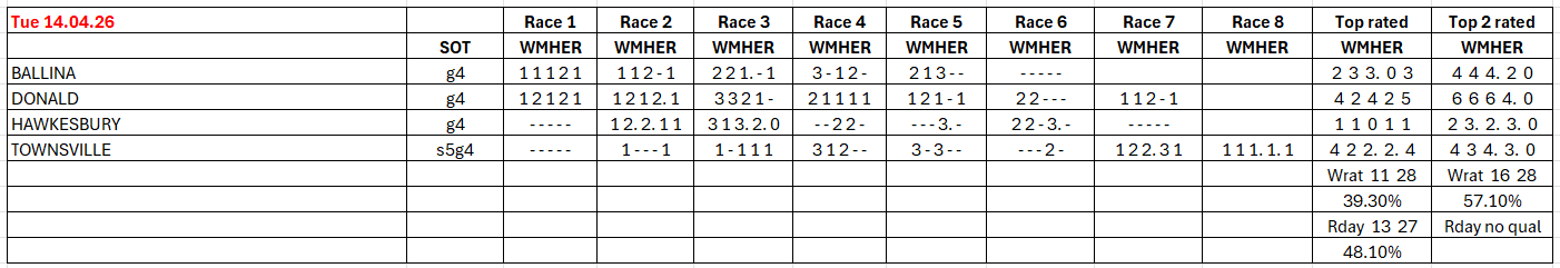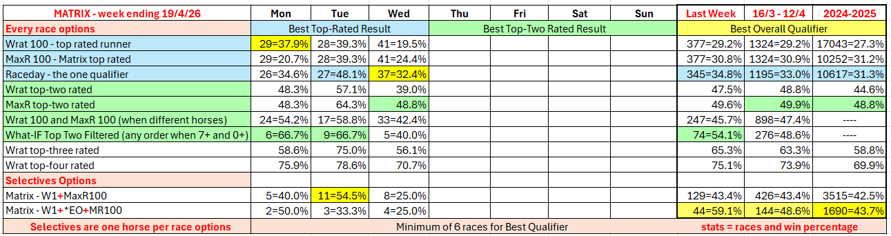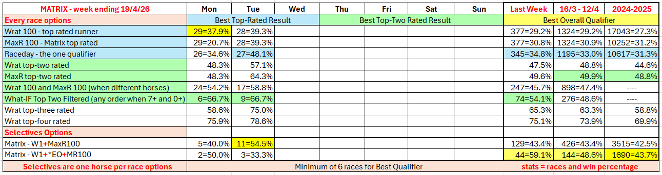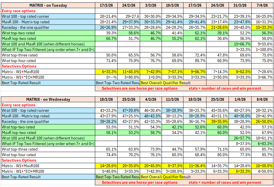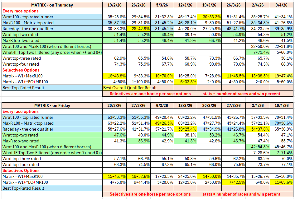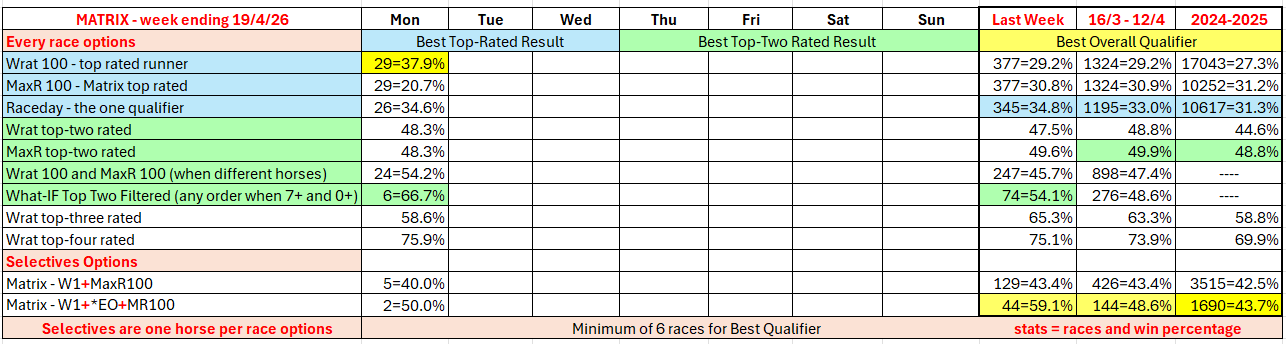 The full day-by-day results for Wizard (Wrat) top 4 rated runners, the Raceday Qualifier, and the Matrix (MaxR) 100 pointer, the MaxR top-two, the Matrix W1+MaxR100 qualifier, and the Matrix W1+*EO+MaxR100 qualifier. Columns also show the overall results for last week and the last four weeks, and the WRat results for the full 2023-2024 racing season. This results summary is colour coded so that it is easier for readers to track the relative performance of the Top Rated (blue) and Top-Two Rated (green) ratings options on a daily, and longer term, basis. The best overall qualifier (yellow) is also highlighted.