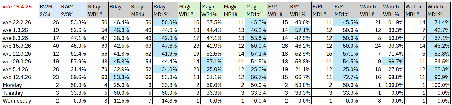 (Key: The first of the two columns for each Selective combination shows number of qualifying races and the second column shows the strike rate. Headings: RWM is Raceday,Watch,Magic, RWM 2/3 means two or three qualifying, Rday is Raceday report qualifier , Magic is Magic report qualifier, R/M is Raceday and Magic, WR1 is Wrat 100, MR1 is MaxR 100, Watch is a Watch report qualifier.)