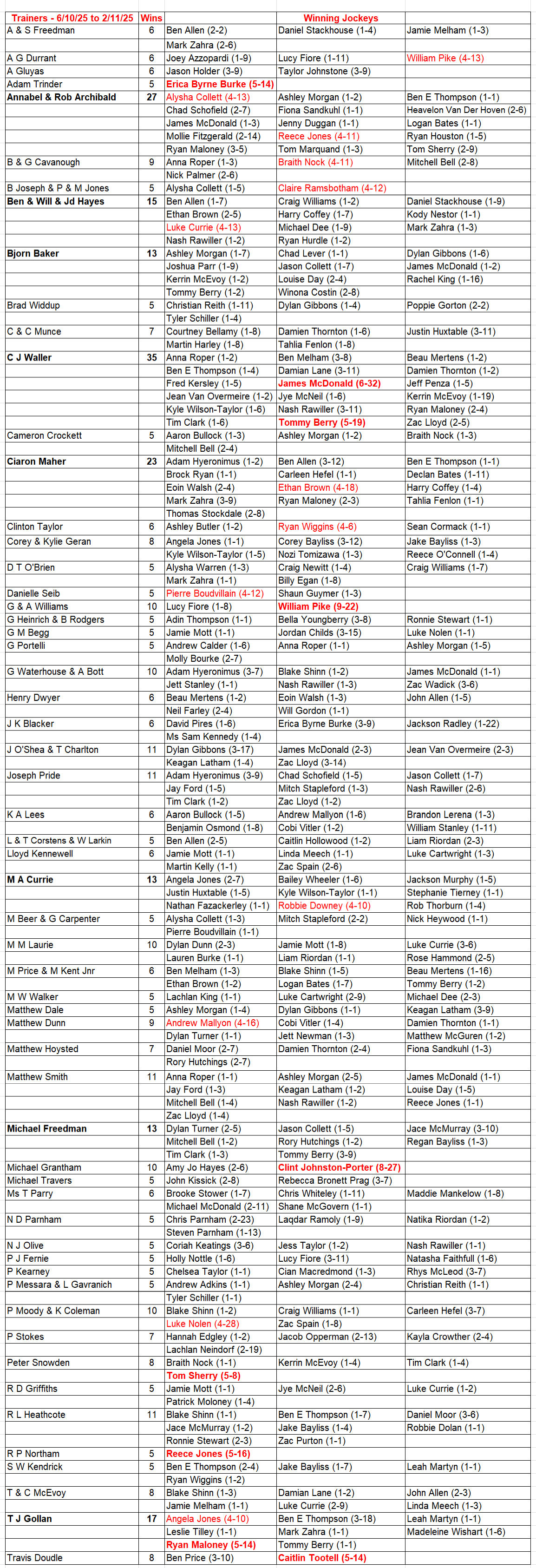 Each Monday I post a table showing the stables that have won at least 5 races over the previous 4 weeks and list the jockeys who rode at least one of those winners, as well as their total rides for the stable, during that period.