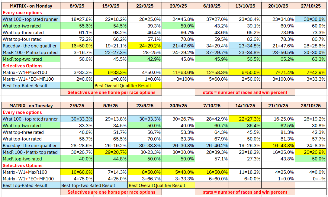 - Matrix - day by day analysis for Monday and Tuesday racing