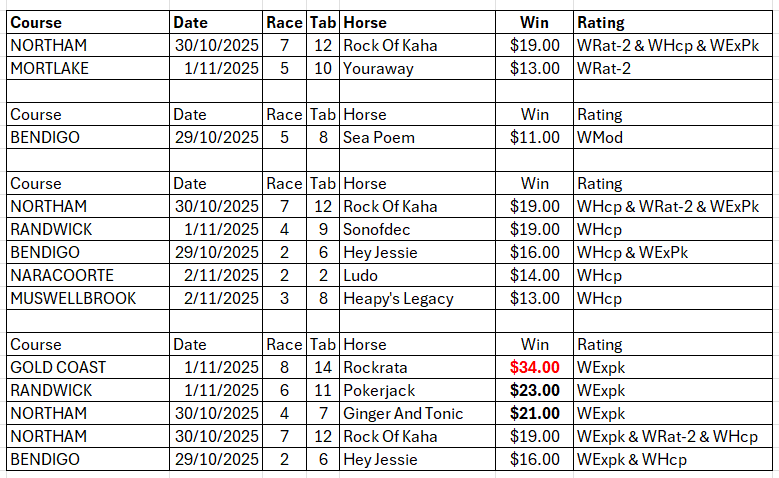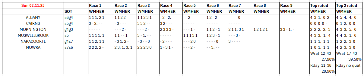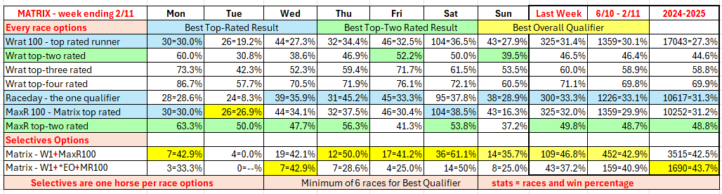 The full day-by-day results for Wizard (Wrat) top 4 rated runners, the Raceday Qualifier, and the Matrix (MaxR) 100 pointer, the MaxR top-two, the Matrix W1+MaxR100 qualifier, and the Matrix W1+*EO+MaxR100 qualifier. Also included are the overall results for last week and the last four weeks. The 2023-2024 column shows the WRat results for the full 2023-2024 racing season. This results summary is colour coded so that it is easier for readers to track the relative performance of the Top Rated (blue) and Top-Two Rated (green) ratings options on a daily, and longer term, basis. The best overall qualifier (yellow) is also highlighted. (The Matrix report is posted to this website between 10:30am and 10:45am, and updated around 12 noon, each day.)