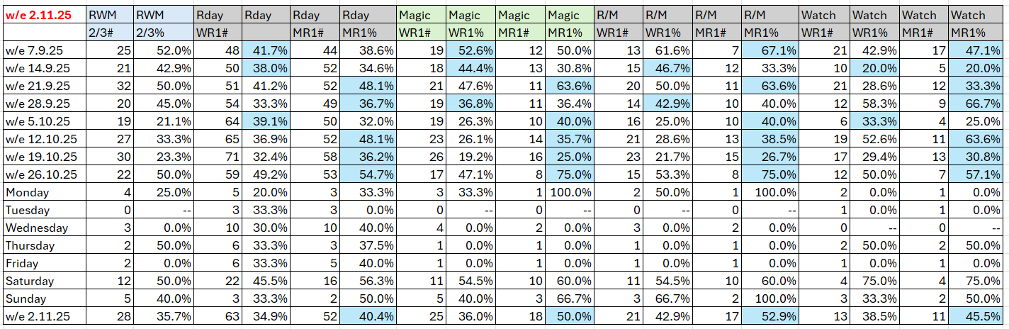 (Key: The first of the two columns for each Selective combination shows number of qualifying races and the second column shows the strike rate. Headings: RWM is Raceday,Watch,Magic, RWM 2/3 means two or three qualifying, Rday is Raceday report qualifier, Magic is Magic report qualifier, R/M is Raceday and Magic, WR1 is Wrat 100, MR1 is MaxR 100.)